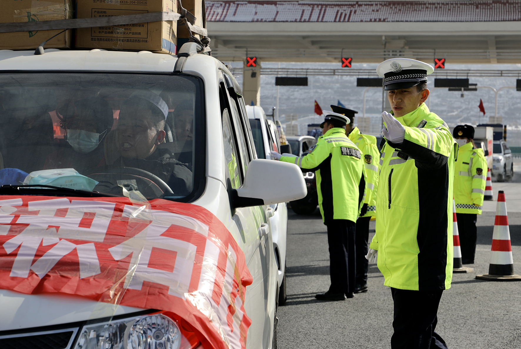圖四:12月21日,民輔警在積石山臨大高速路口疏導(dǎo)交通,保證車(chē)輛有序通行。