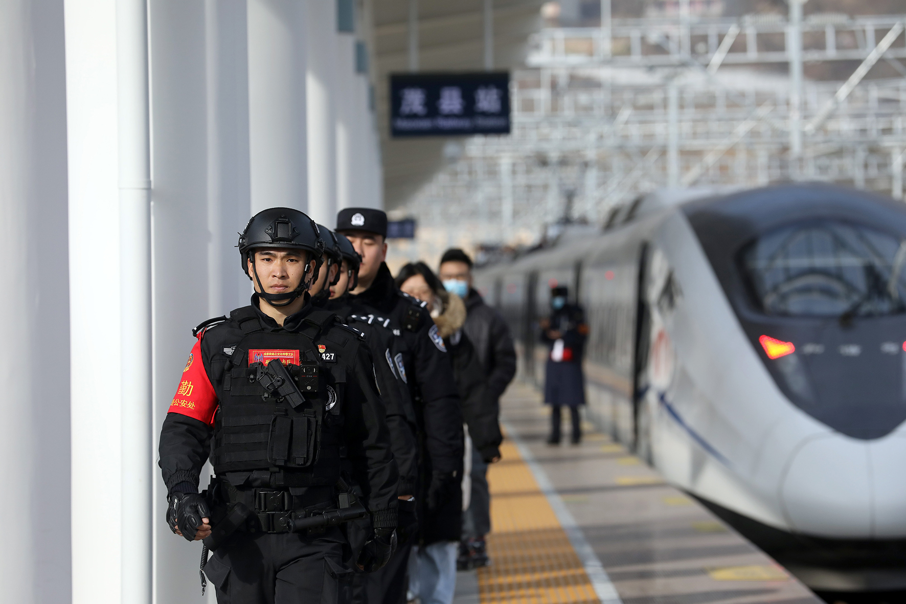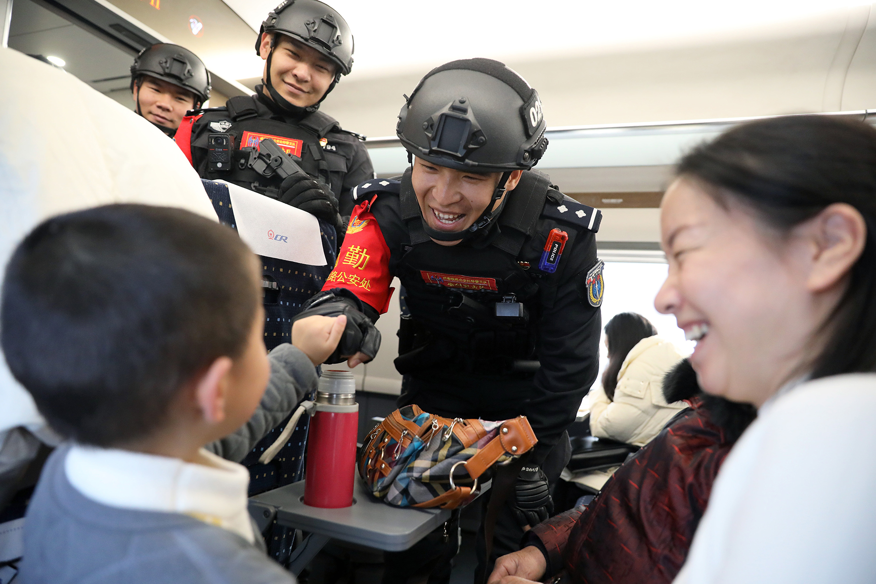 12月29日,在成都東開(kāi)往茂縣的C6006次動(dòng)車(chē)組列車(chē)上,一隊(duì)警容嚴(yán)整、精神飽滿的特警隊(duì)員格外引人注目,他們是成都鐵路公安處特警支隊(duì)民警,為旅客安全出行護(hù)航。