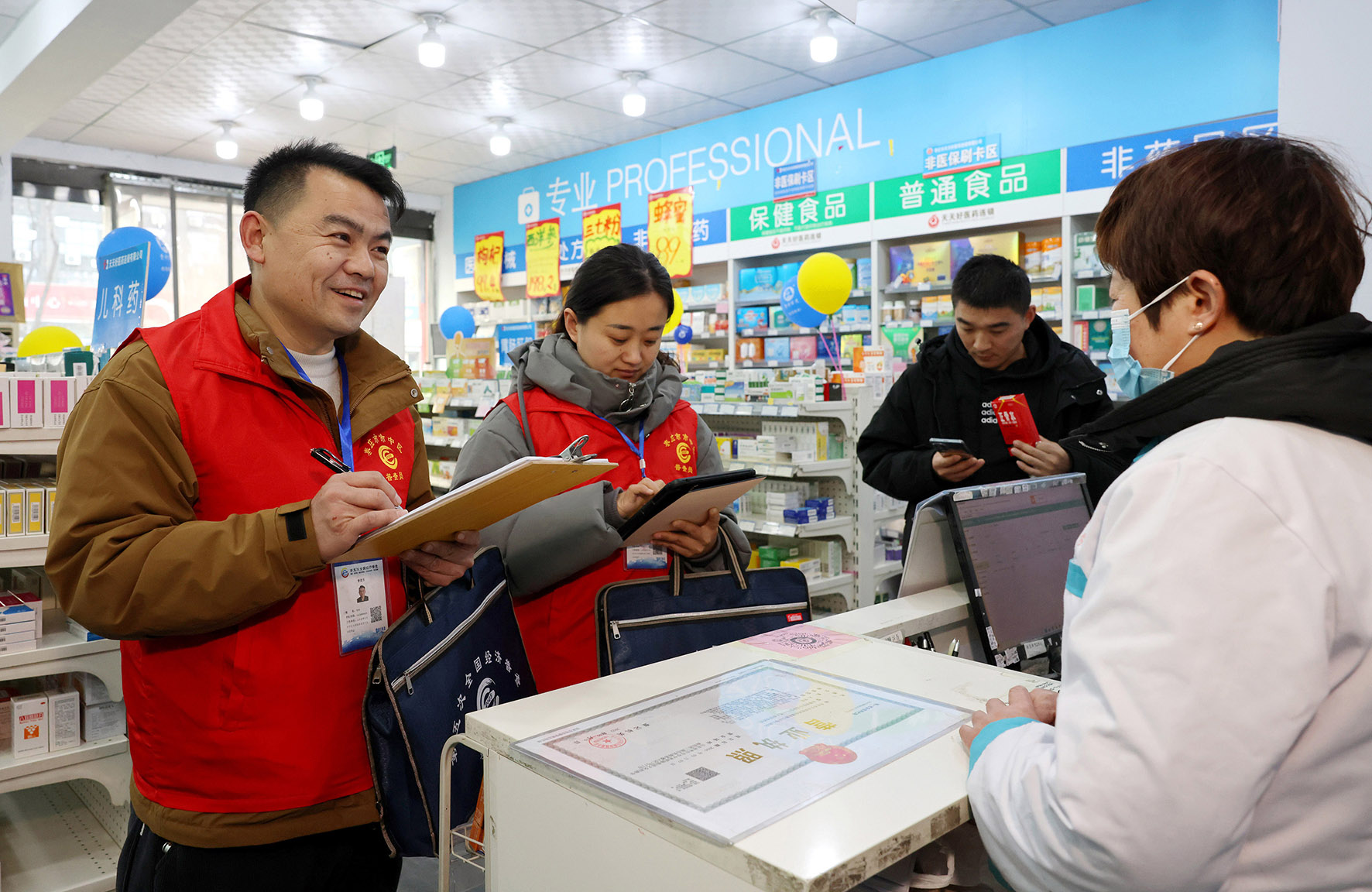 1月1日,山東省棗莊市市中區(qū)光明路街道普查員在一連鎖藥店普查登記信息。當(dāng)日,第五次全國經(jīng)濟(jì)普查現(xiàn)場登記工作正式啟動(dòng)。