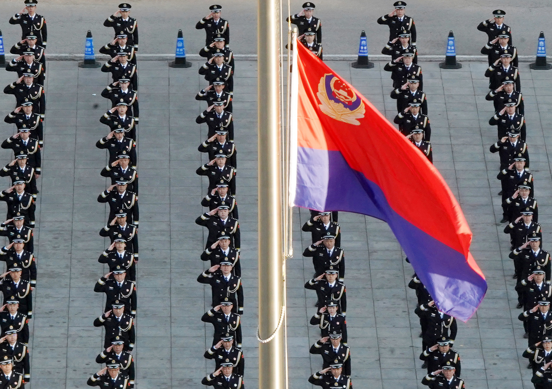1月10日,山東省煙臺(tái)市公安局舉行升警旗儀式慶祝第四個(gè)中國人民警察節(jié),民警身著禮服向警旗敬禮,并重溫入警誓詞。