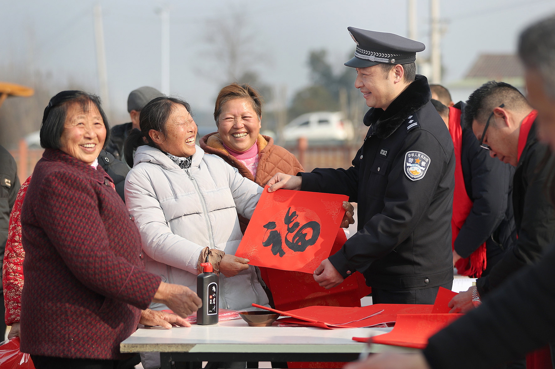 1月12日,在湖北省掇刀區(qū)團林鋪鎮(zhèn)合星村,荊門市公安局高新區(qū)·掇刀區(qū)分局團林派出所民警向村里老人送上“平安?!薄?/span>