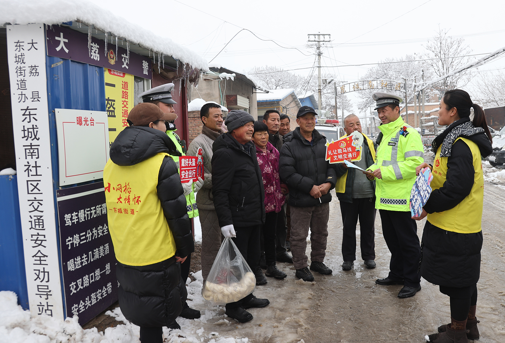 1月17日,在陜西大荔縣東城街道東城南社區(qū)的交通安全勸導(dǎo)站,民警與社區(qū)干部在勸導(dǎo)群眾大雪過(guò)后應(yīng)注意交通安全。