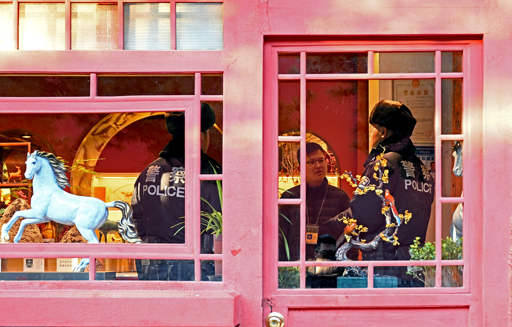 民警向神武門附近的商戶宣講安全防范知識。