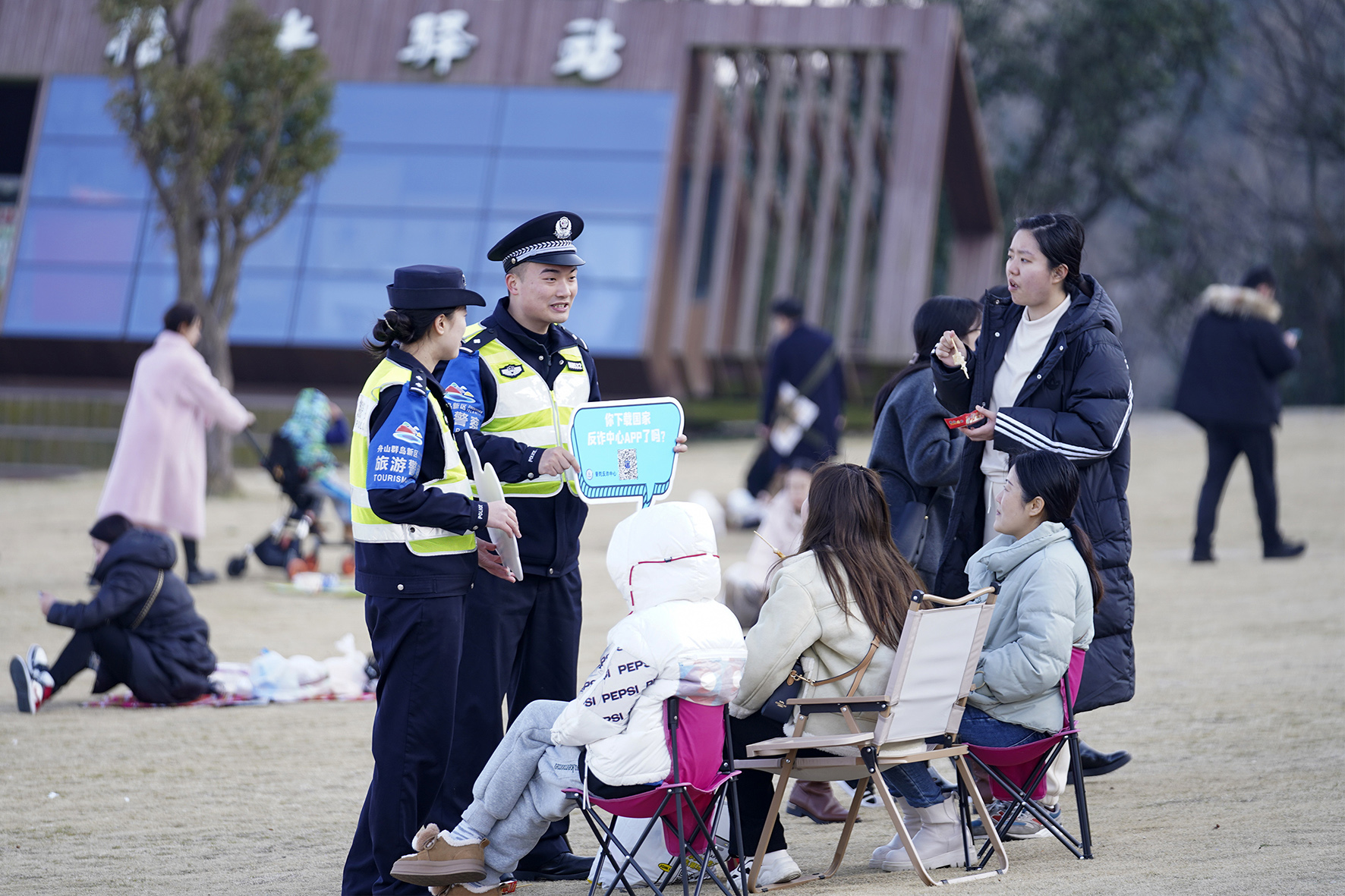 2月11日,浙江省舟山市公安局普陀區(qū)分局東港派出所民警在景點開展安全巡查、反詐宣傳及服務(wù)游客工作,守護景點平安。