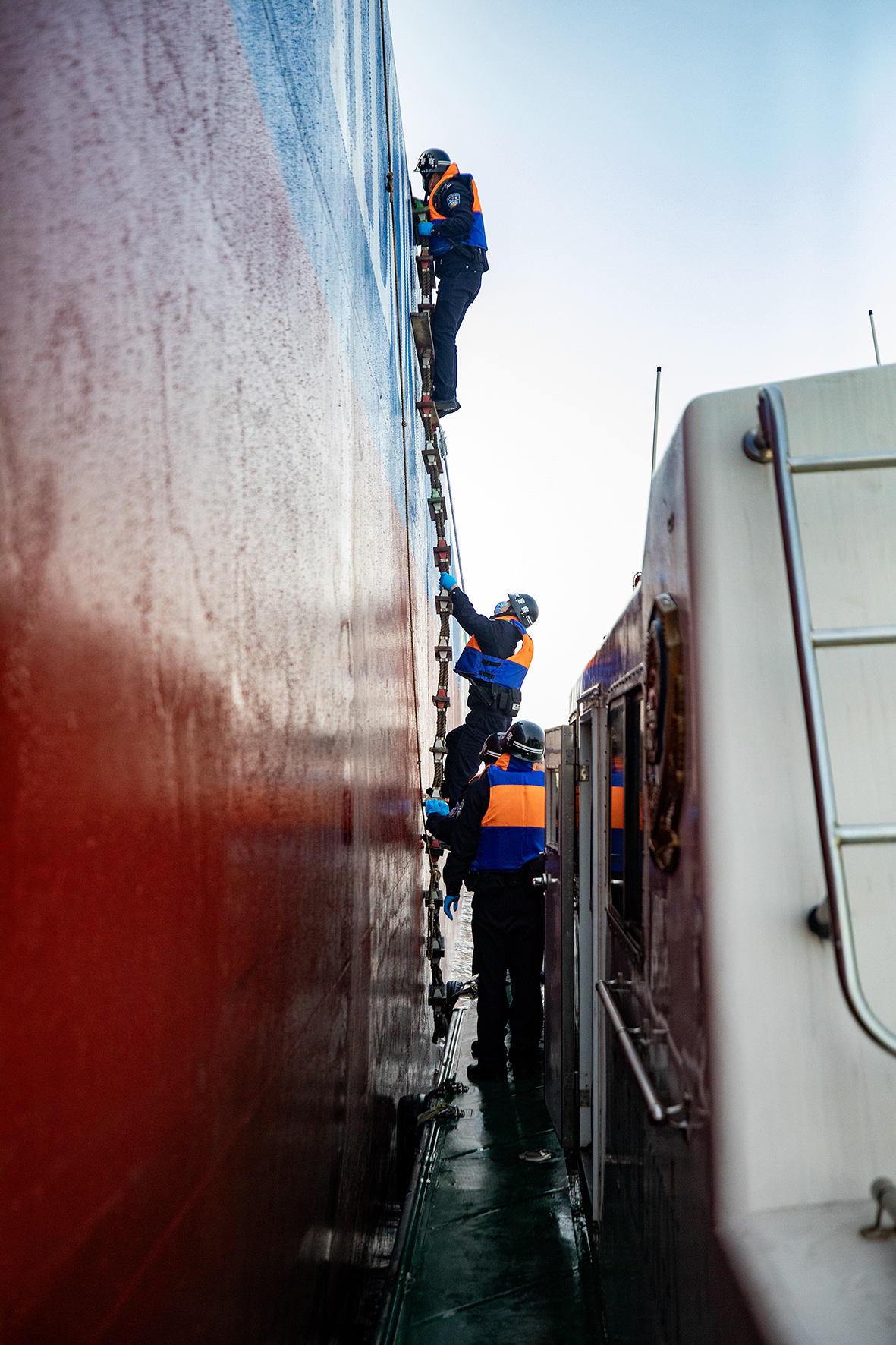2月11日,長江航運公安局鎮(zhèn)江分局聯(lián)合鎮(zhèn)江出入境邊防檢查站全力服務(wù)港口安全生產(chǎn),船舶快速通關(guān)。