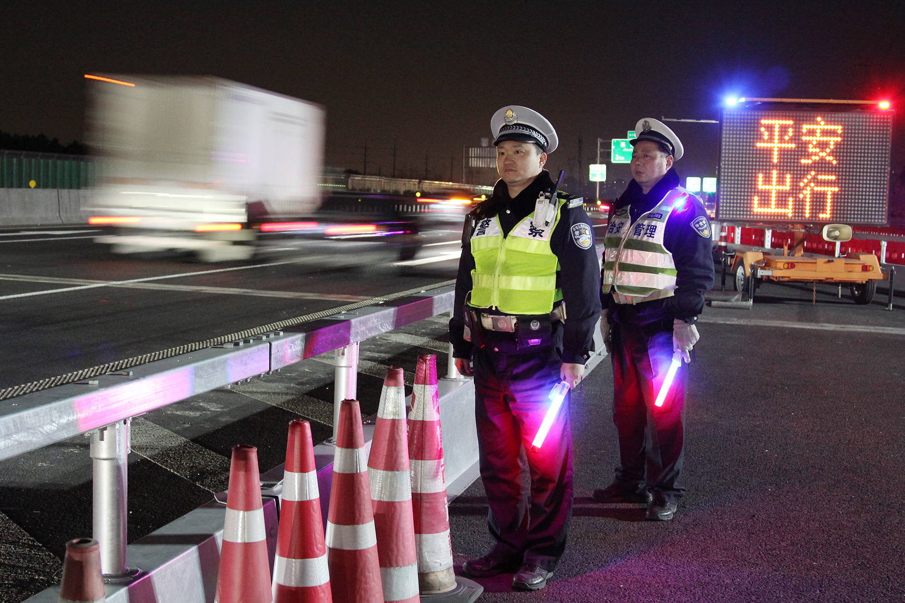 2月16日晚,上海市公安局嘉定分局交警支隊朱橋檢查站民輔警在G15沈海高速朱橋段駐守觀測、疏導(dǎo)返程入滬車流。