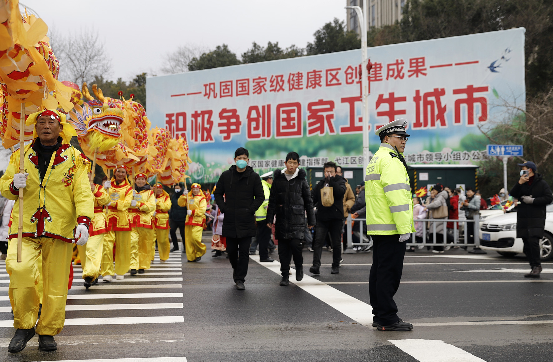 2月24日,安徽省蕪湖市舉行“龍騰盛世 福滿江城”元宵節(jié)傳統(tǒng)民俗巡游活動(dòng),蕪湖市公安局交警支隊(duì)全警上崗,服務(wù)市民,守護(hù)市民平安過節(jié)。