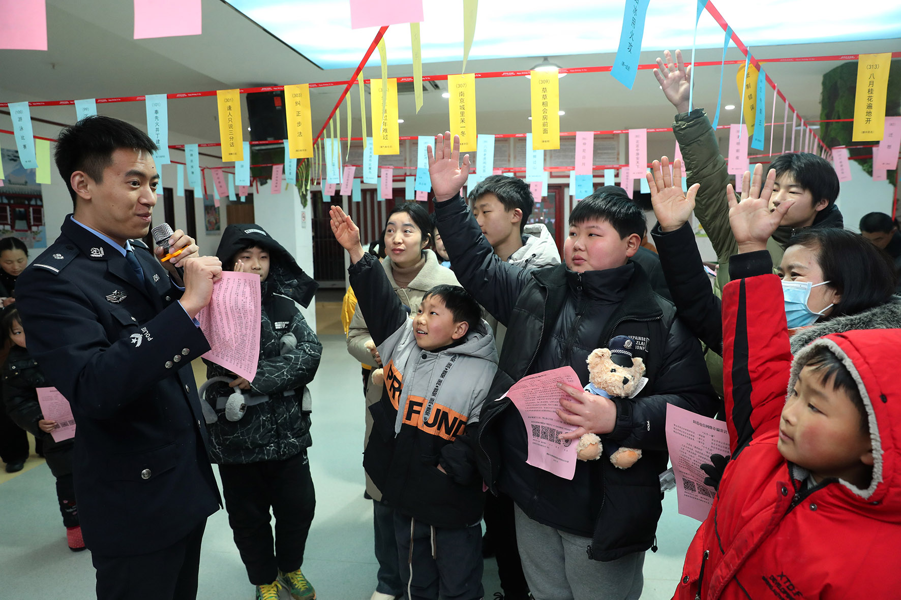 2月24日,安徽省蒙城縣“慶新春 鬧元宵”有獎(jiǎng)猜謎活動(dòng)現(xiàn)場,民警向家長和孩子們介紹燈謎游戲中的反詐知識(shí)。