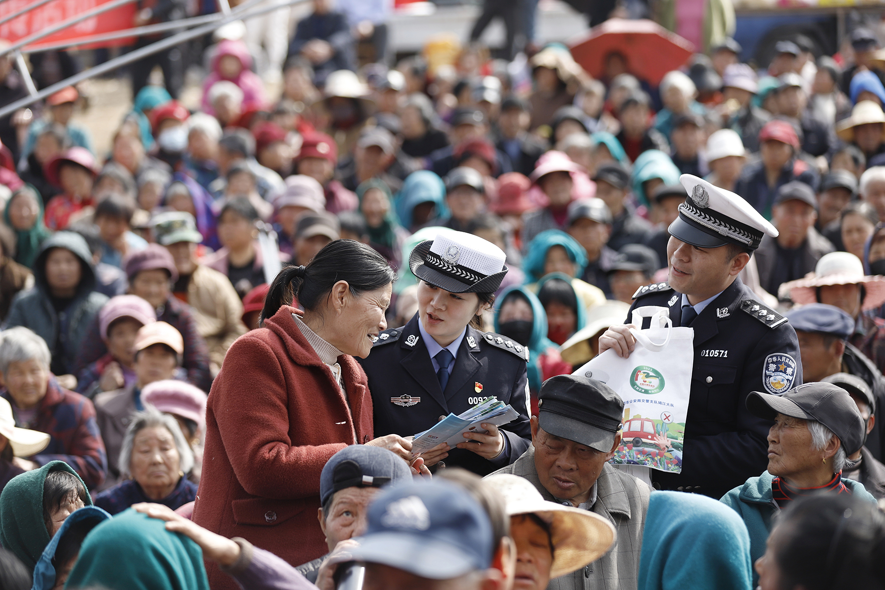 3月8日,安徽省蕪湖市公安局交警支隊(duì)鳩江大隊(duì)民警在湯溝鎮(zhèn)前進(jìn)村廬劇演出現(xiàn)場,向群眾講解“一盔一帶”等交通安全知識(shí)。