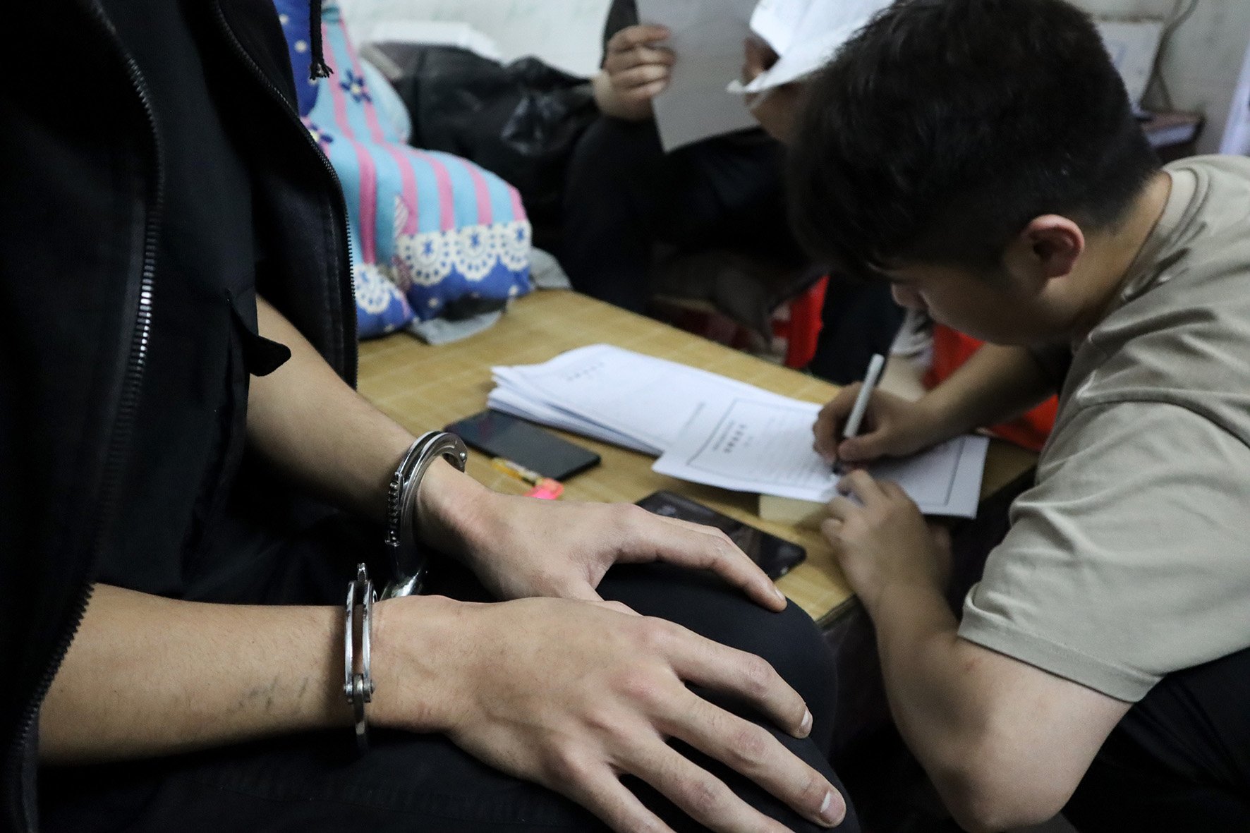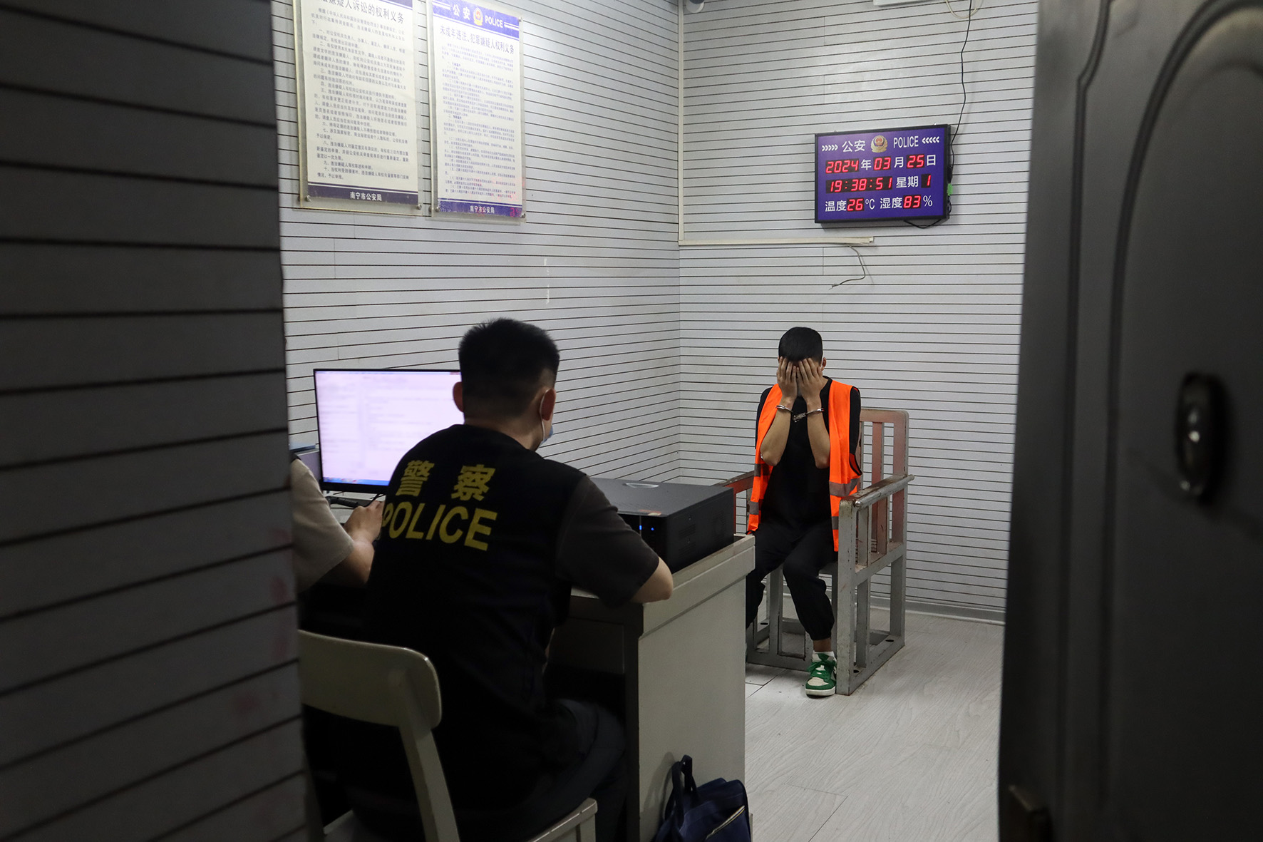 3月25日,在廣西南寧市公安局江南派出所,山東省濟(jì)南市公安局市中區(qū)分局民警對(duì)電詐嫌疑人張某進(jìn)行審訊。