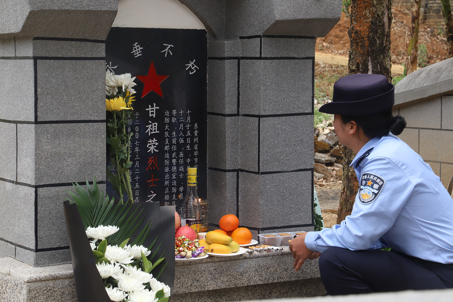 4月1日,云南出入境邊防檢查總站德宏邊境管理支隊?wèi)衾吘撑沙鏊窬视袂賮淼搅沂扛绺绺首鏄s墓前進行祭奠。