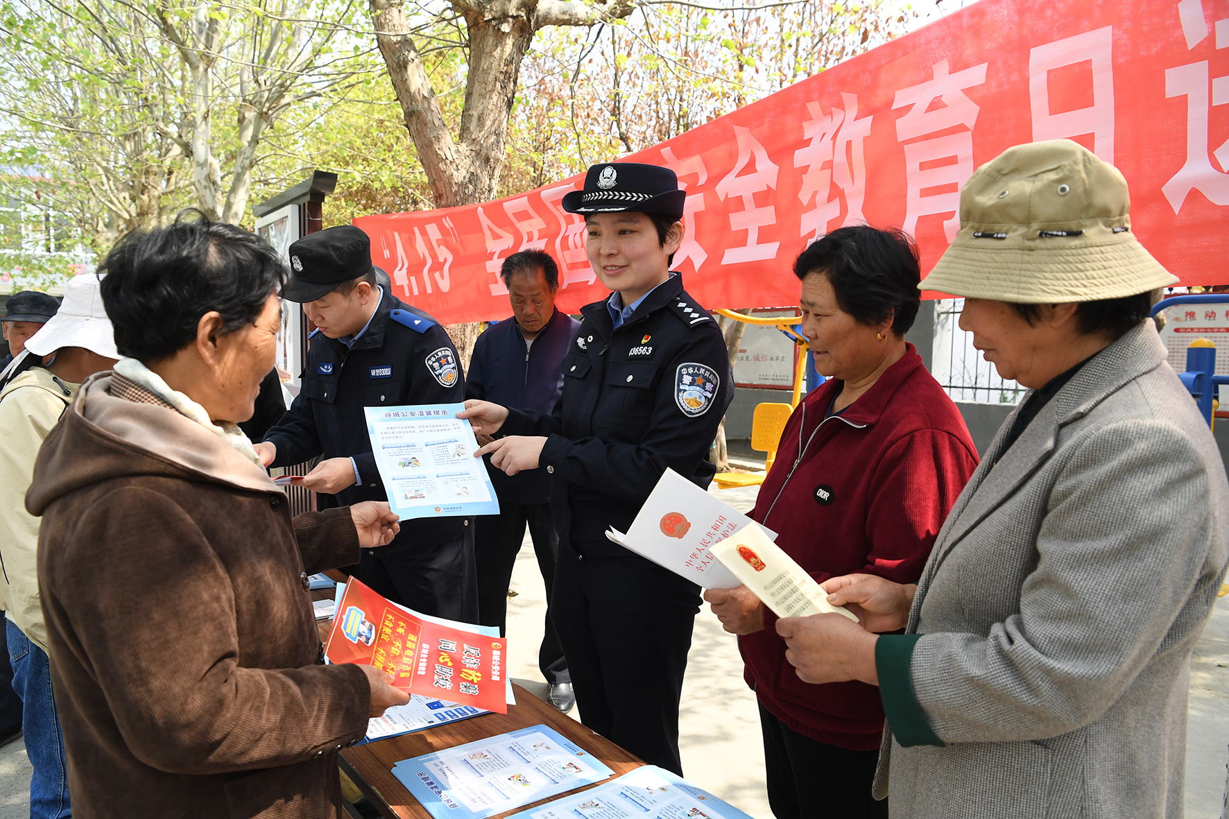 4月11日,山東省棗莊市公安局薛城分局鳳鳴湖派出所民輔警在轄區(qū)高樓社區(qū)全民國(guó)家安全教育日宣傳活動(dòng)。