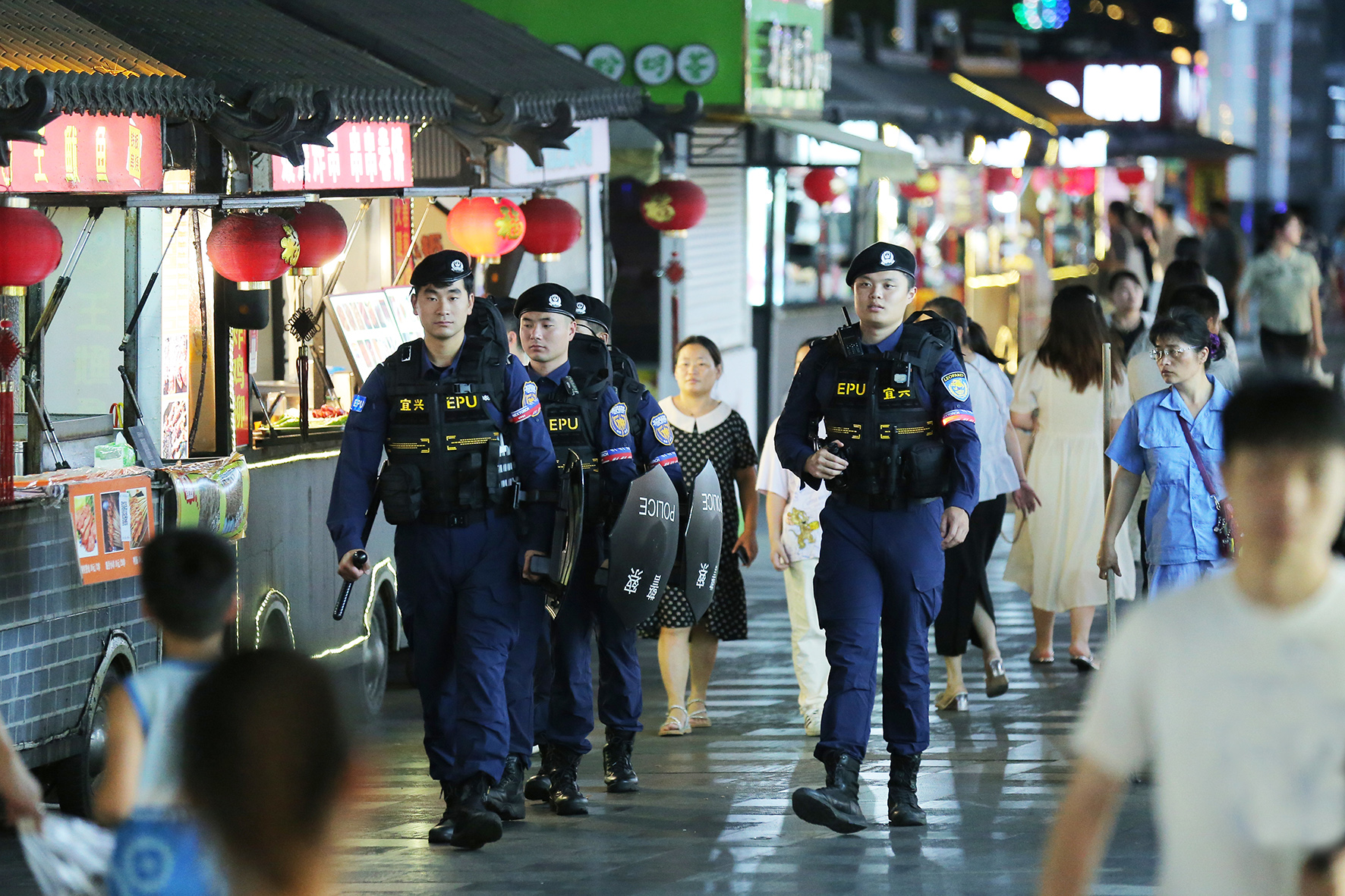 7月7日,江蘇省宜興市公安局巡特警EPU精英小隊囤警街面夜市,亮燈見警,守護夏夜平安煙火氣。