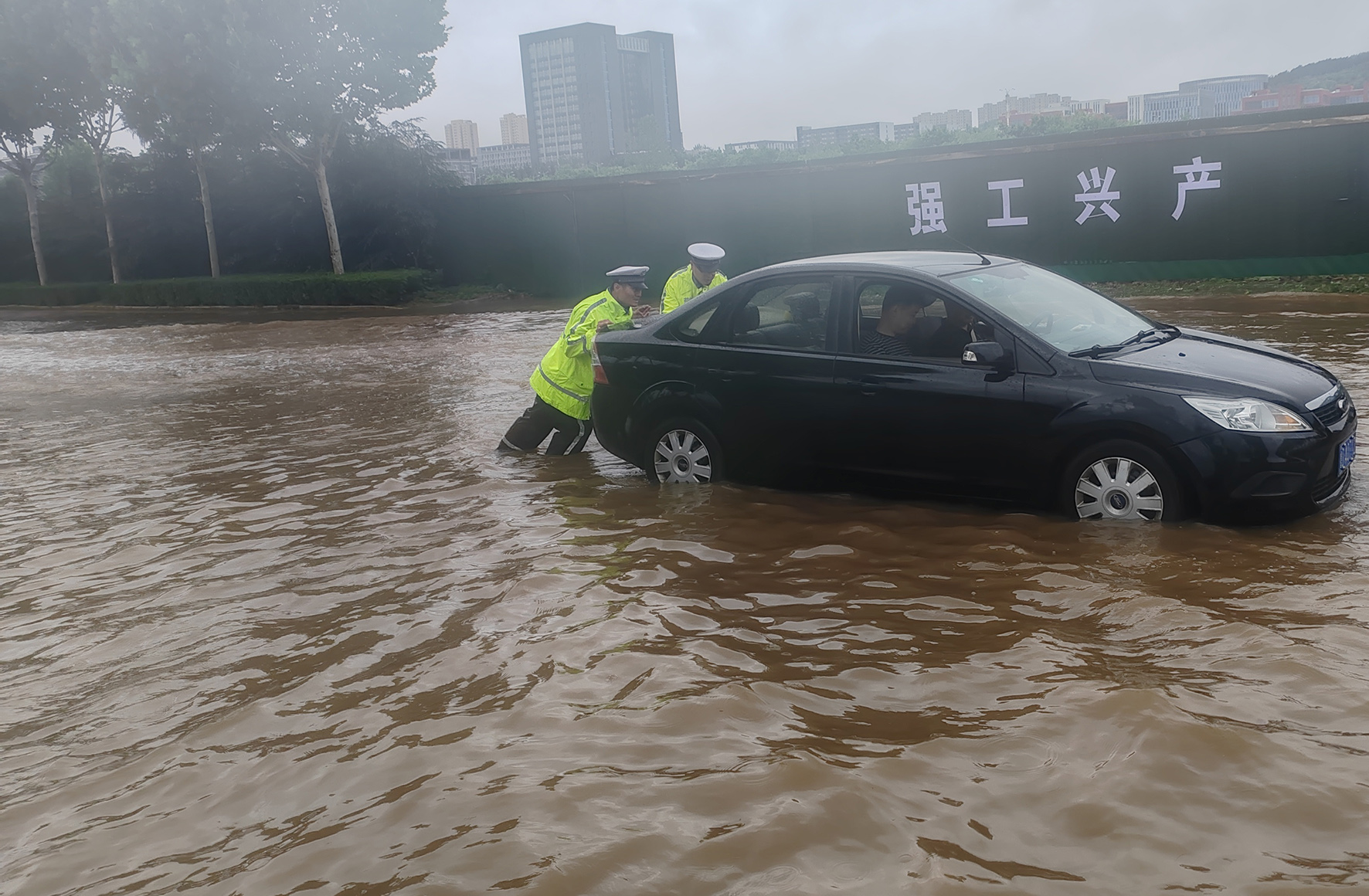 7月8日,山東省棗莊市公安局高新交警大隊(duì)民輔警在轄區(qū)積水嚴(yán)重路段幫助被困車輛脫險(xiǎn)。