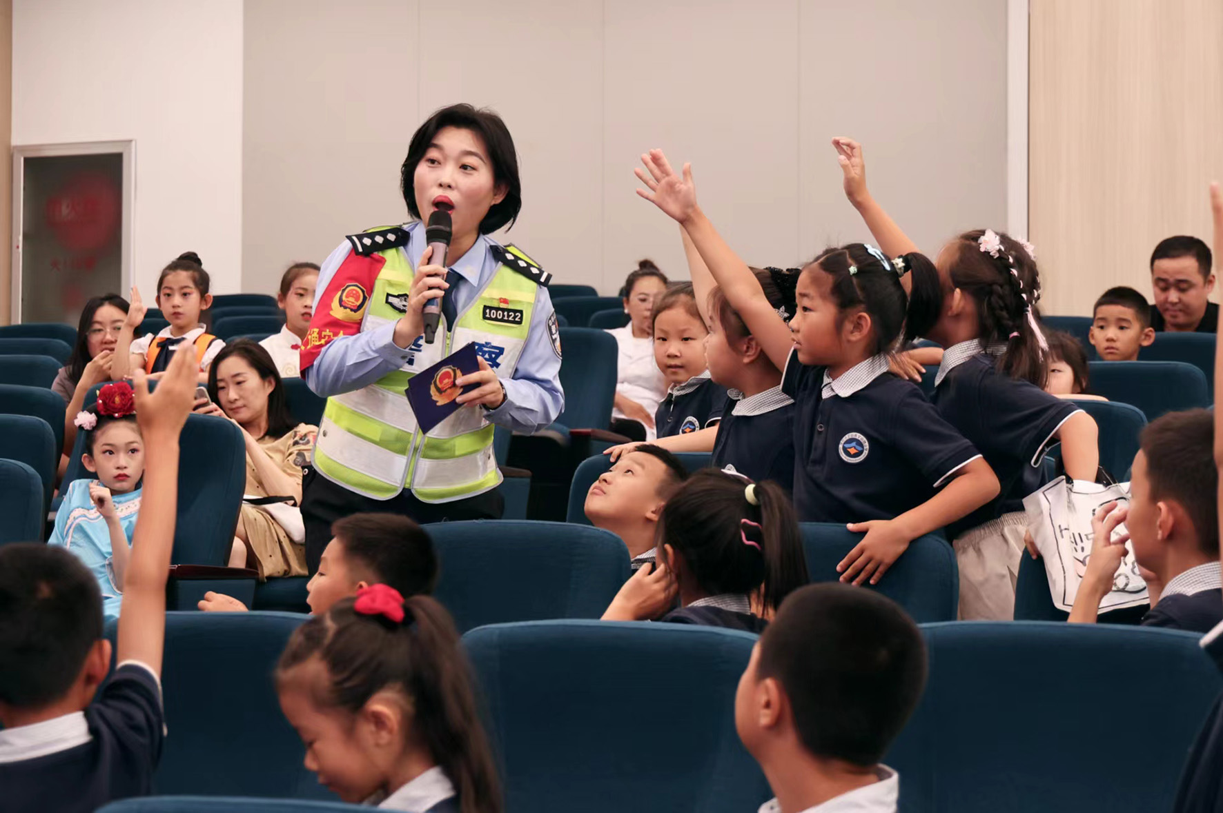 圖為7月11日,民警與學(xué)生們互動(dòng)學(xué)習(xí)交通知識(shí)。