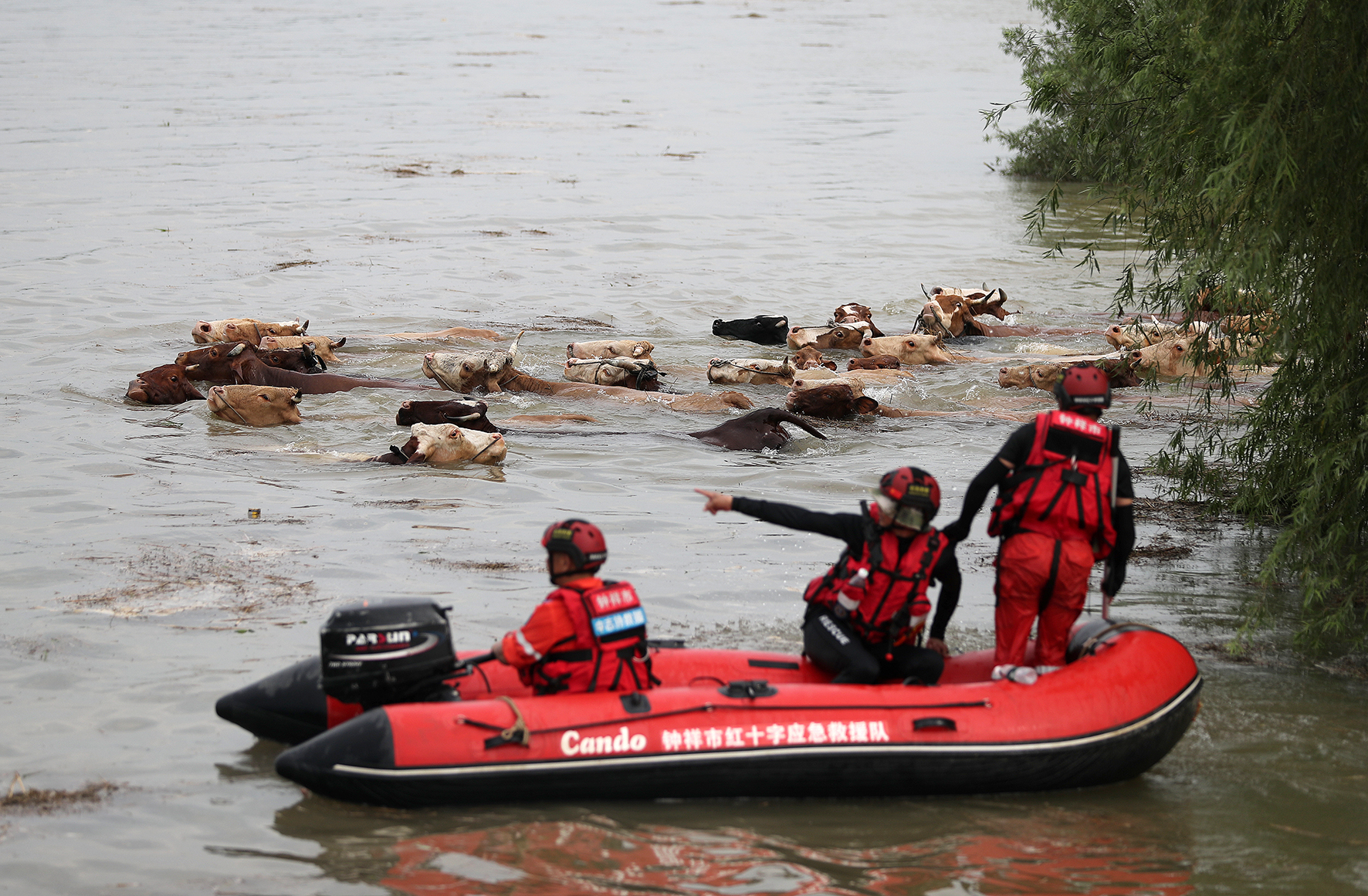 圖四:救援人員涉水引導(dǎo)被困牛群。