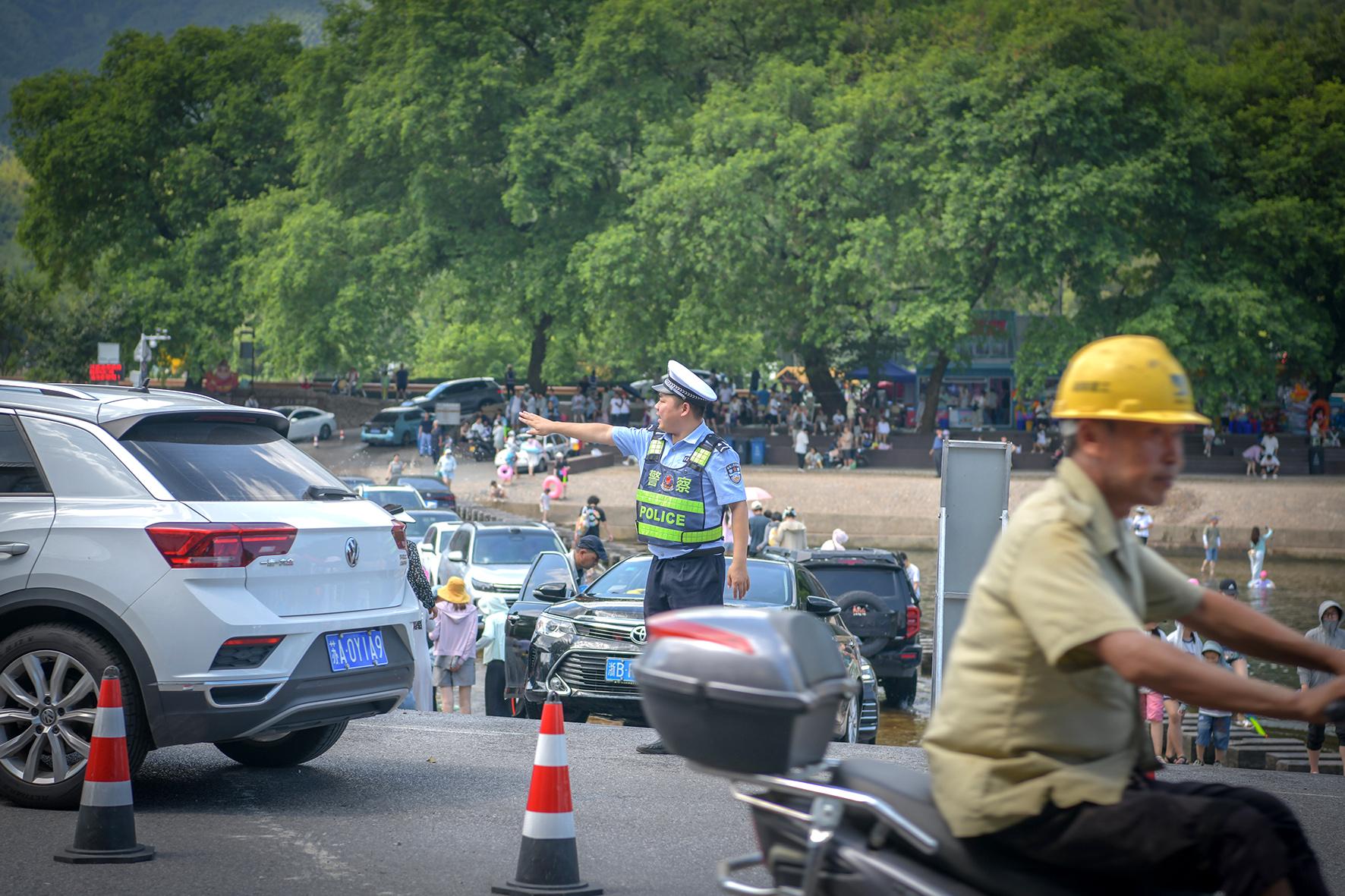 8月3日,氣溫40度。安徽省涇縣公安局民警在涇縣蔡村鎮(zhèn)“月亮灣”景區(qū)疏導交通。
