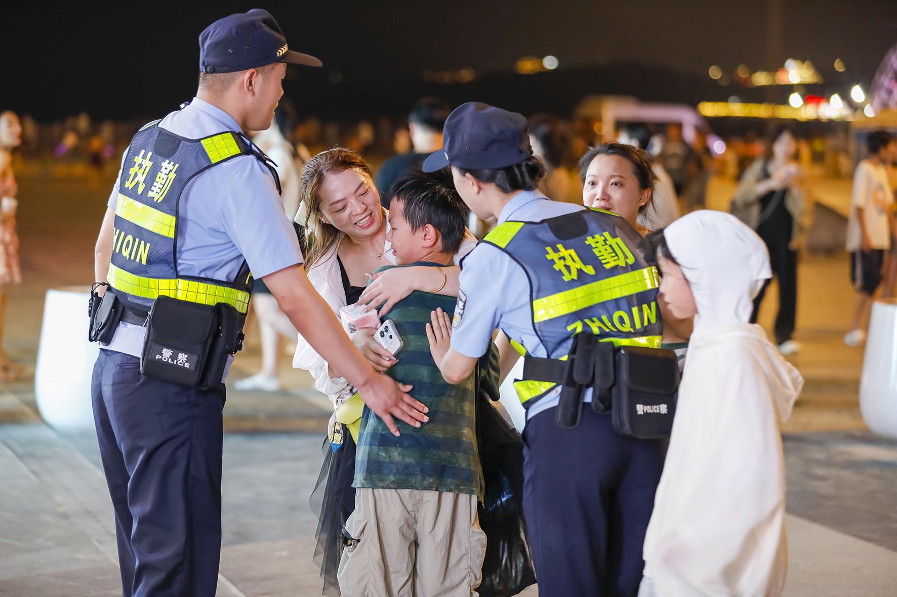 8月11日晚,福建省平潭綜合實(shí)驗(yàn)區(qū)公安局民警在龍王頭海洋公園幫助一名走失的兒童找到家長(zhǎng)。