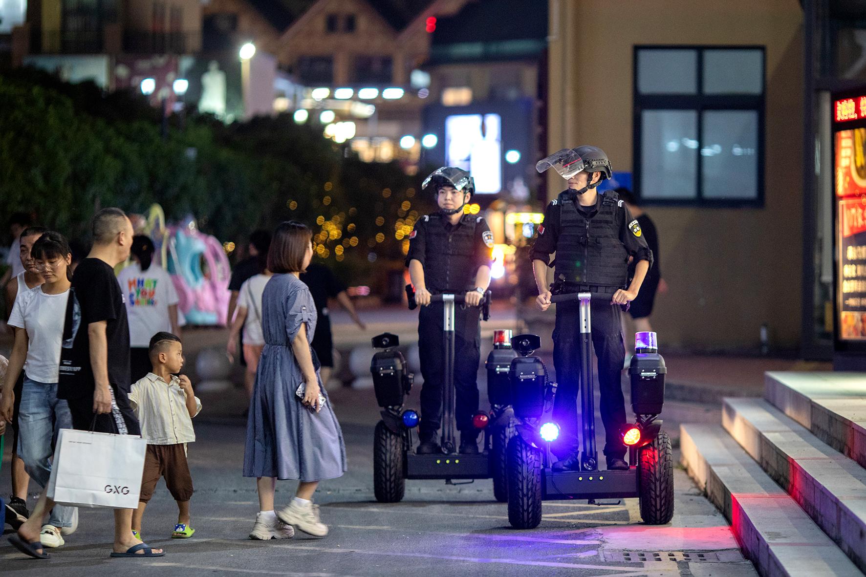 8月12日夜,浙江省臺州市公安局黃巖分局院橋派出所輕裝PTU小隊利用平衡車在院橋鎮(zhèn)的商業(yè)街區(qū)開展巡邏。為進一步打造平安夏夜,黃巖警方利用多種巡邏模式,加大對主要街道、夜市攤點、等重點區(qū)域、人員密集場所的巡邏防控力度,持續(xù)開展“見警察、見警燈、見警車”行動。