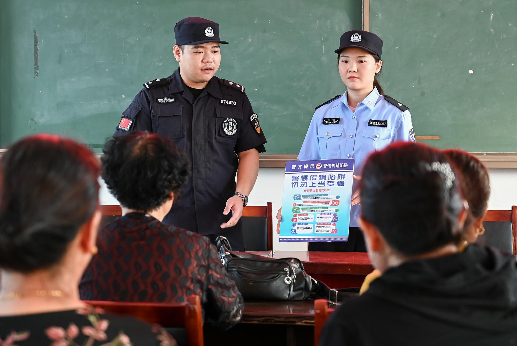 8月20日,安徽省和縣公安局經(jīng)偵大隊(duì)民警在白橋鎮(zhèn)老年大學(xué)開(kāi)展反傳銷宣傳。