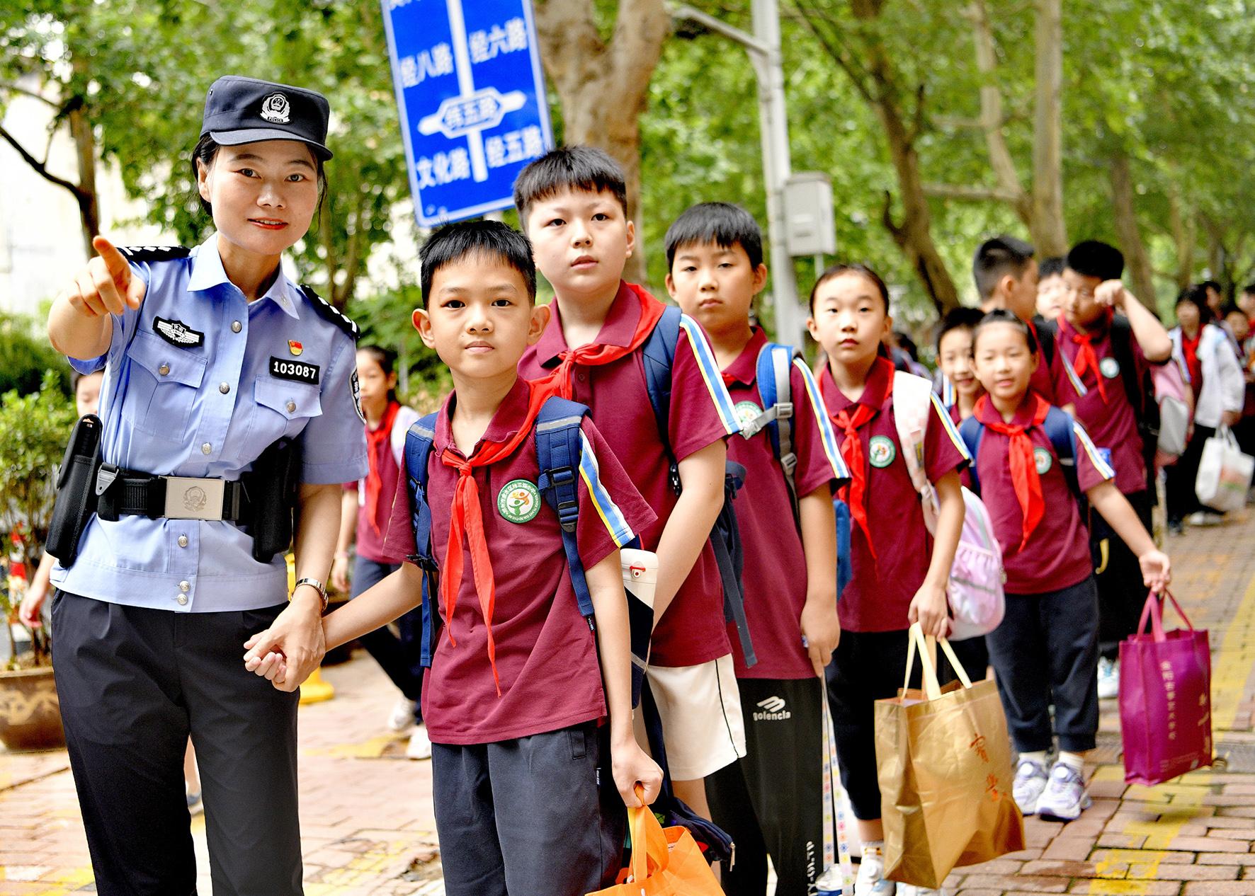 8月26日,河南省鄭州市中小學(xué)開學(xué)第一天。鄭州市公安局金水分局經(jīng)八路派出所民輔警在轄區(qū)緯三路小學(xué)站好護(hù)學(xué)崗,服務(wù)校園師生。