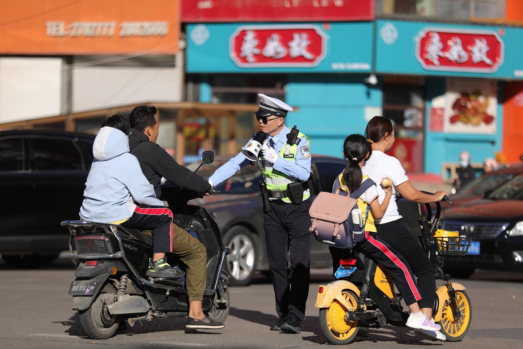 9月12日,遼寧省阜新市公安局交警支隊海州大隊民警叫停糾正不戴頭盔的駕駛?cè)?,用文明勸?dǎo)的方式為城市交通筑起安全防線,讓出行更安全、有序、文明。