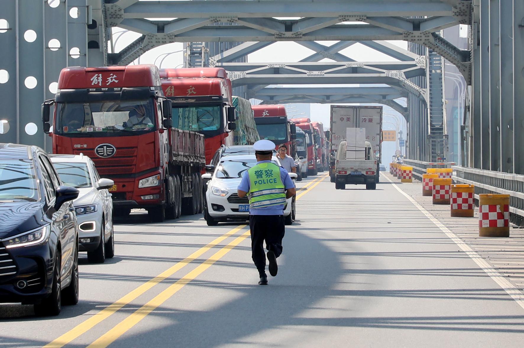 9月17日,江西省九江市公安局交管支隊(duì)第一大隊(duì)民警快速奔向九江長江一橋一起交通事故現(xiàn)場。