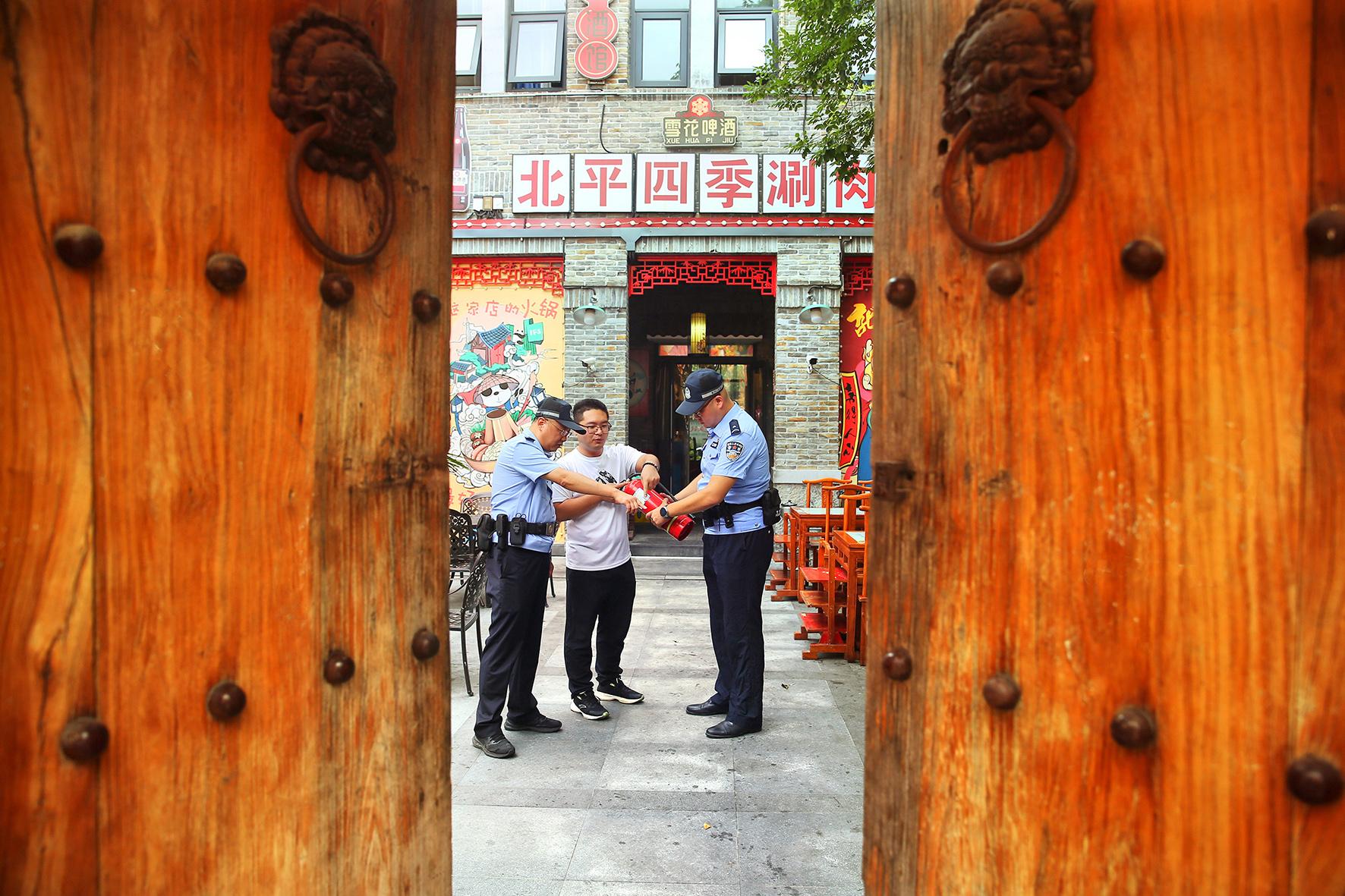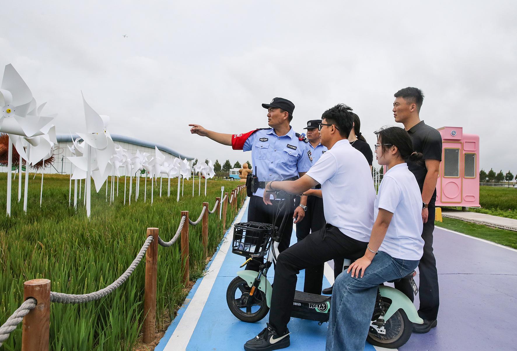 9月17日,山東省臨沂市郯城縣公安局李莊派出所民警輔警在郯城縣醉東風(fēng)鄉(xiāng)村藝棧景點(diǎn)執(zhí)勤巡邏。