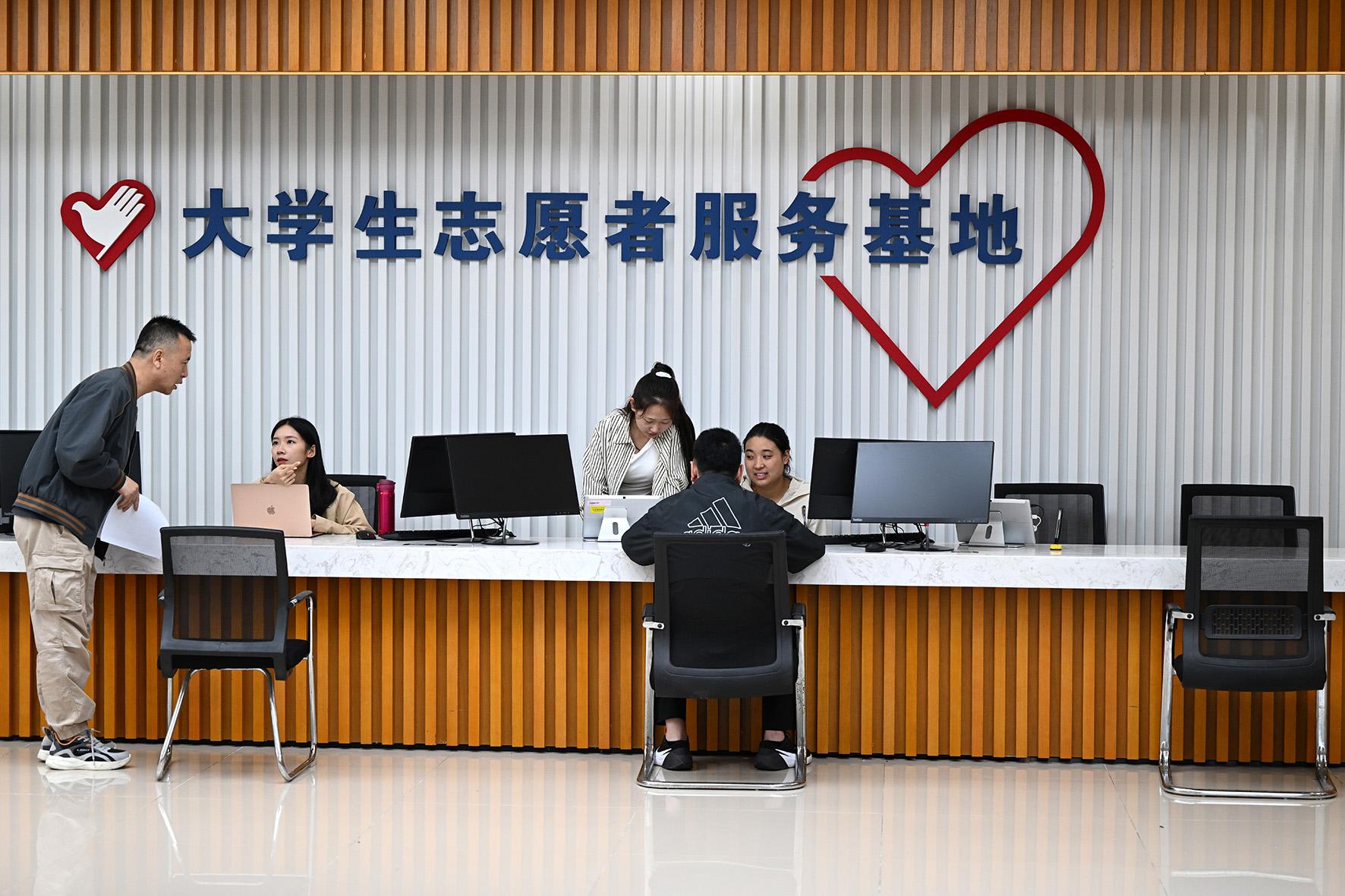 大學(xué)生志愿者正在為群眾解答相關(guān)法律問(wèn)題。2008年,西城區(qū)人民法院與中國(guó)政法大學(xué)合作,設(shè)立全國(guó)首家志愿者服務(wù)基地。