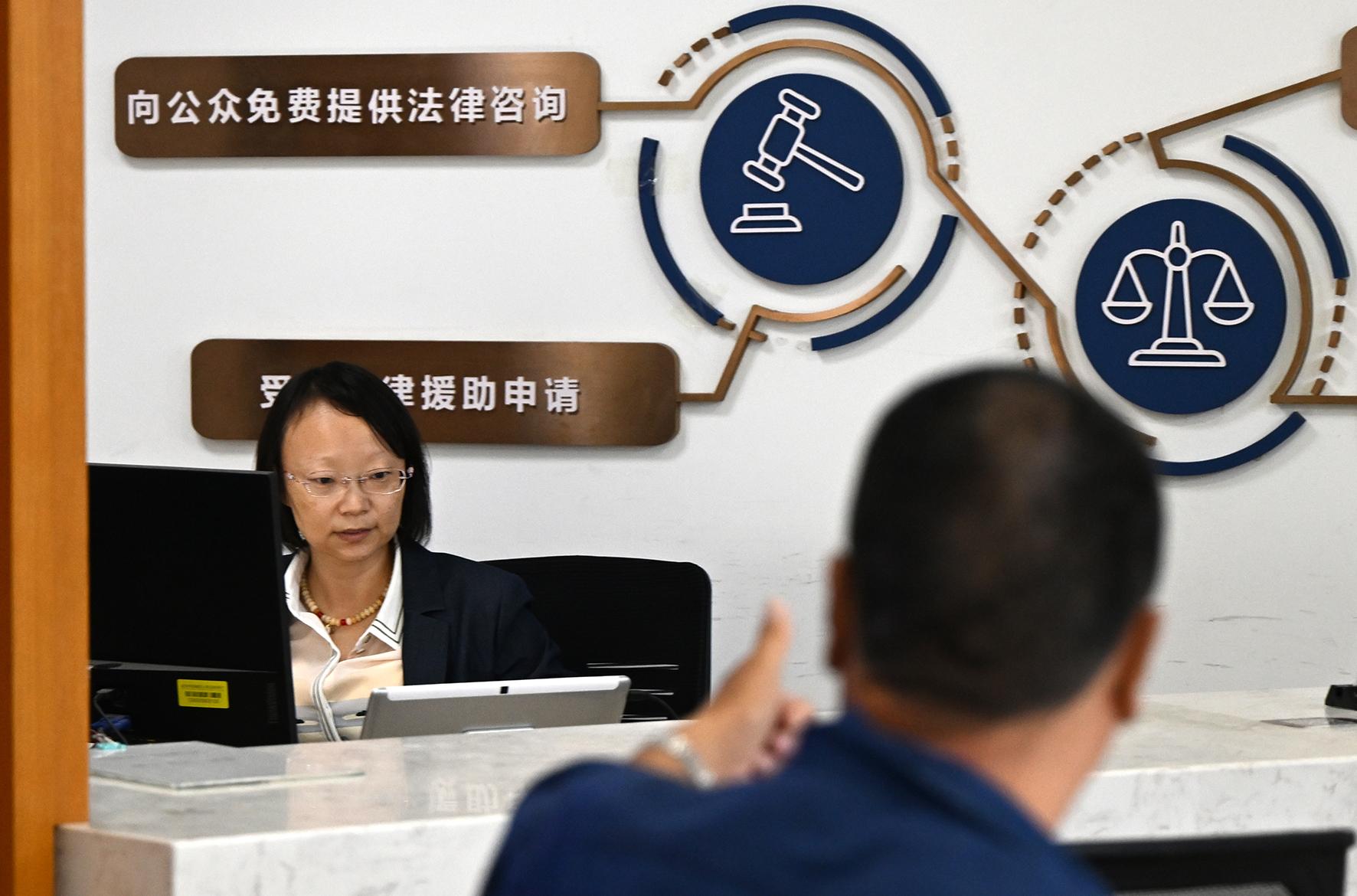 一名群眾的咨詢得到滿意解答后,高興地向法援律師豎起大拇指表示感謝。2015年起,西城區(qū)司法局法援中心律師每周定時(shí)來(lái)法院提供訴訟咨詢、代寫(xiě)文書(shū)及法律援助服務(wù)。
