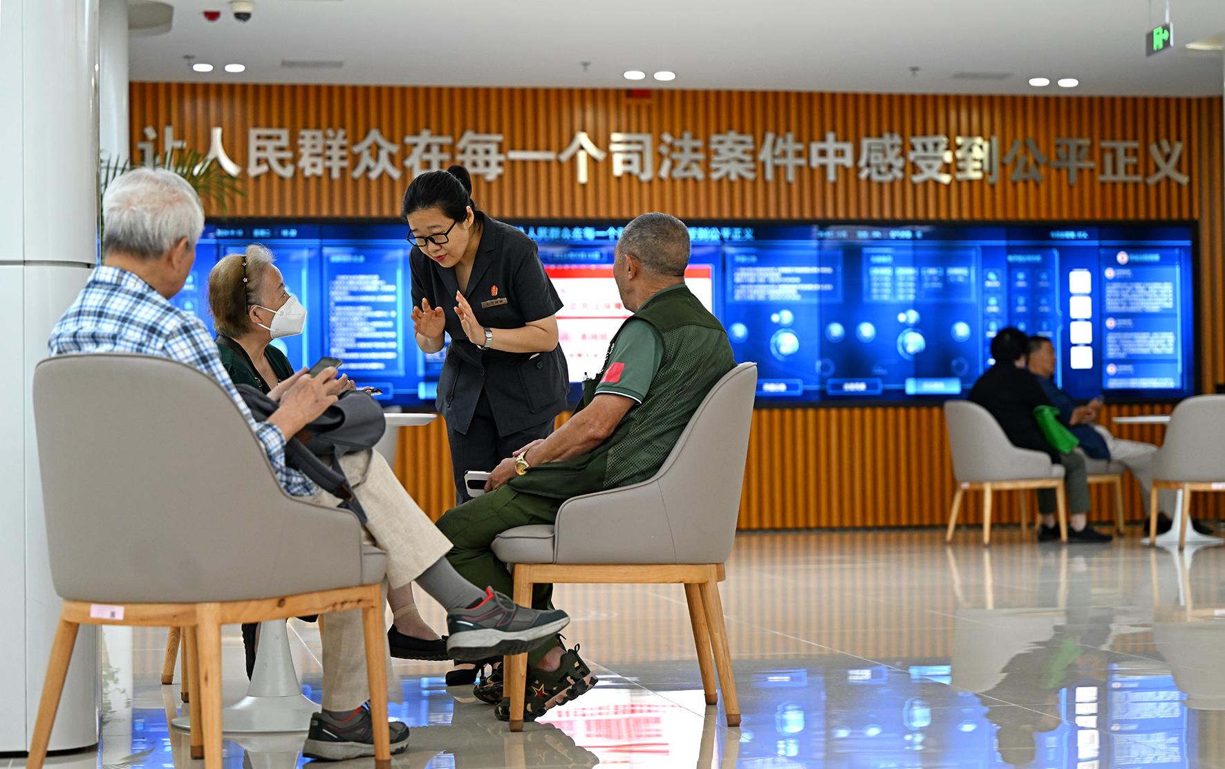 9月10日,北京市西城區(qū)人民法院訴訟服務(wù)中心大廳,立案庭訴服團(tuán)隊(duì)導(dǎo)訴組組長(zhǎng)杜春主動(dòng)上前詢問(wèn)幾位老人的情況,并協(xié)調(diào)解決了他們遇到的立案問(wèn)題。