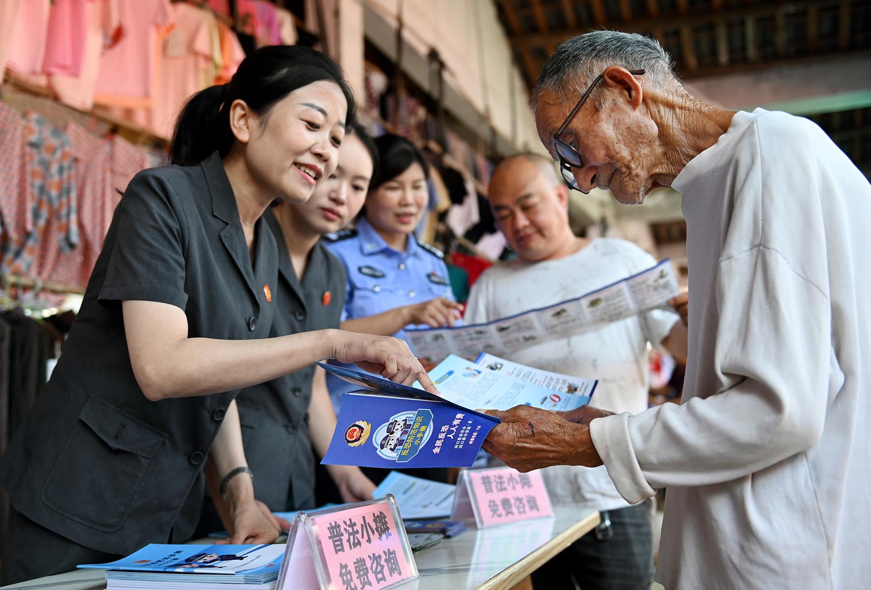 9月19日,湖南省洞口縣人民法院干警在楊林鎮(zhèn)農(nóng)貿(mào)市場向群眾宣講法律知識(shí)。連日來,洞口縣人民法院干警利用當(dāng)?shù)剜l(xiāng)村趕集日,向群眾宣講防范非法集資、反詐、民法典等法律知識(shí)。