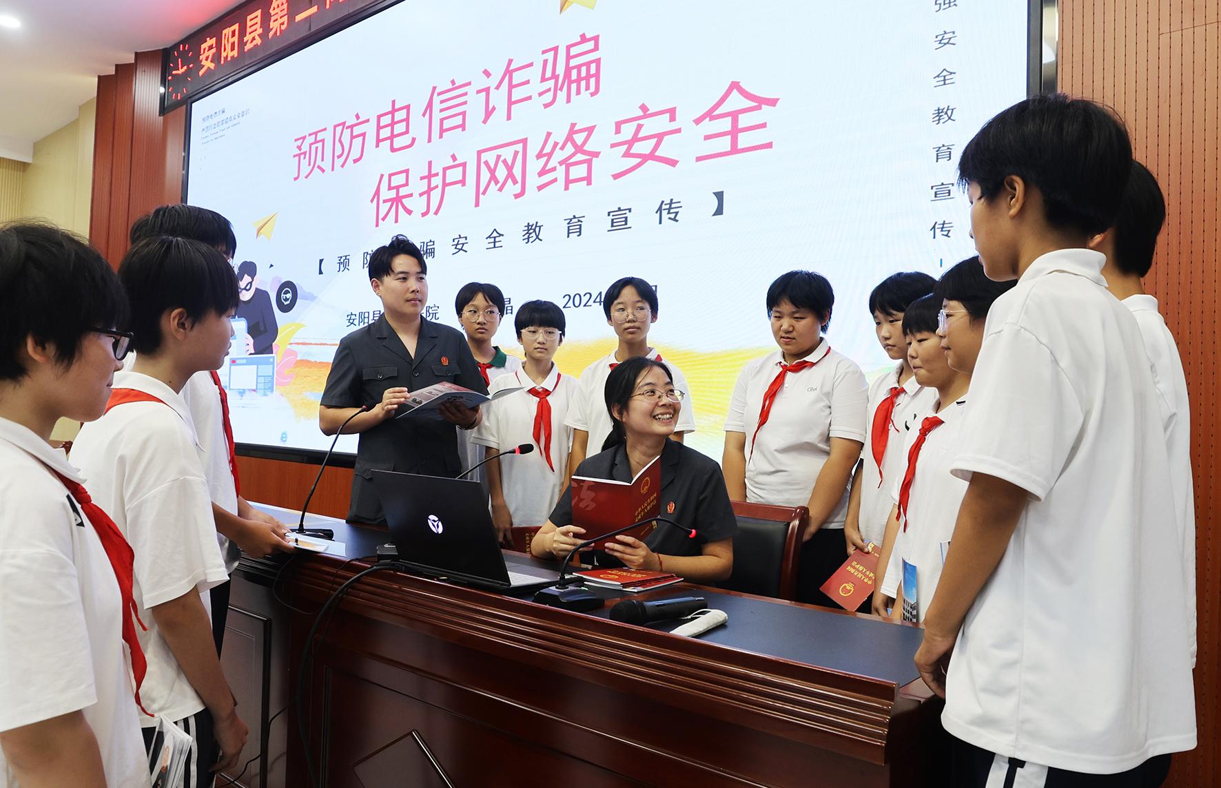 9月20日,河南省安陽縣人民法院組織法官深入第二高級中學(xué)附屬初中開展了以“預(yù)防電信詐騙、保護網(wǎng)絡(luò)安全”為主題的普法宣傳活動。
