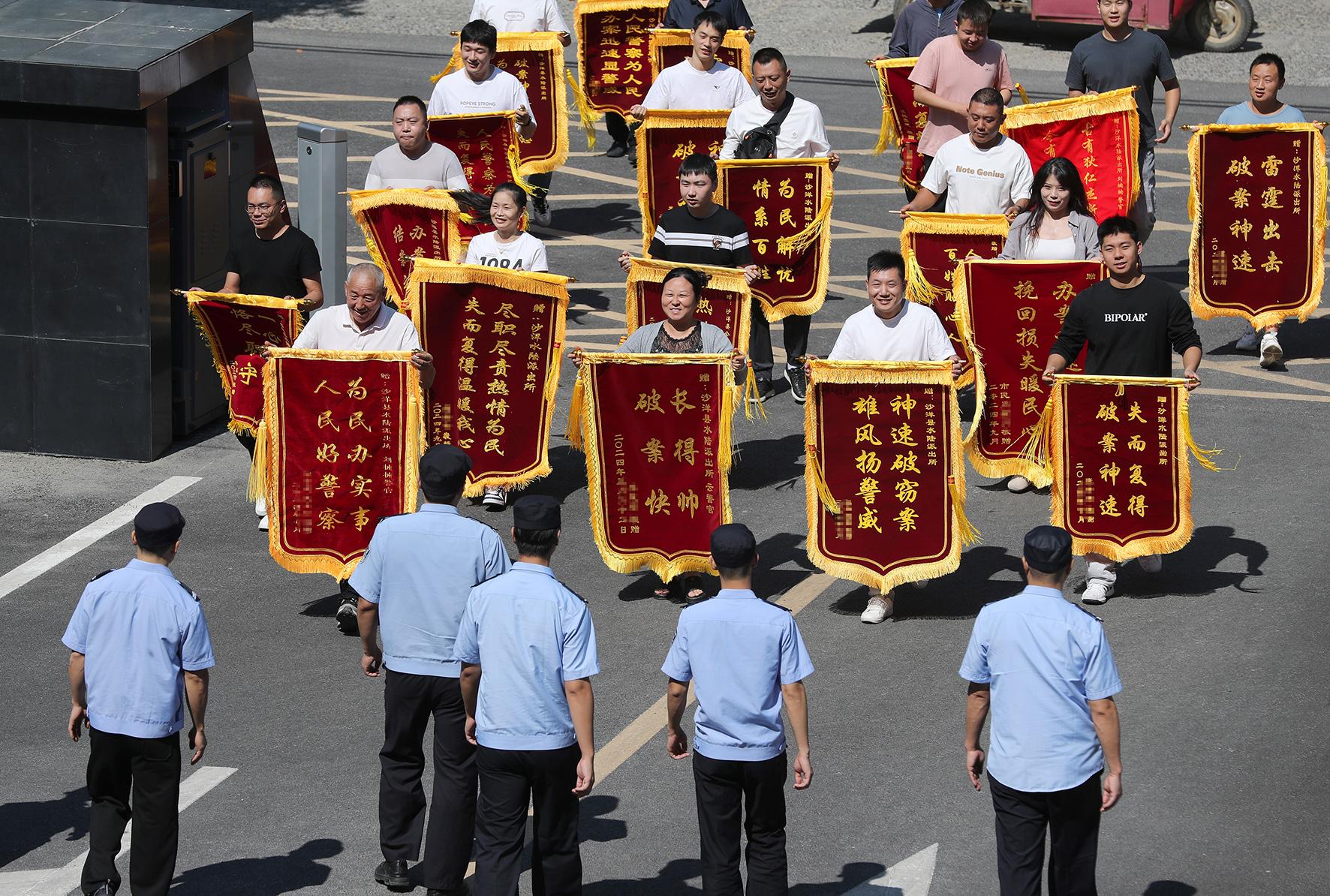 9月23日,湖北省荊門市沙洋縣20名群眾組團(tuán)向沙洋縣公安局沙洋水陸派出所民警送上十八面錦旗,感謝辦案民警為他們追回被盜、被騙財物。