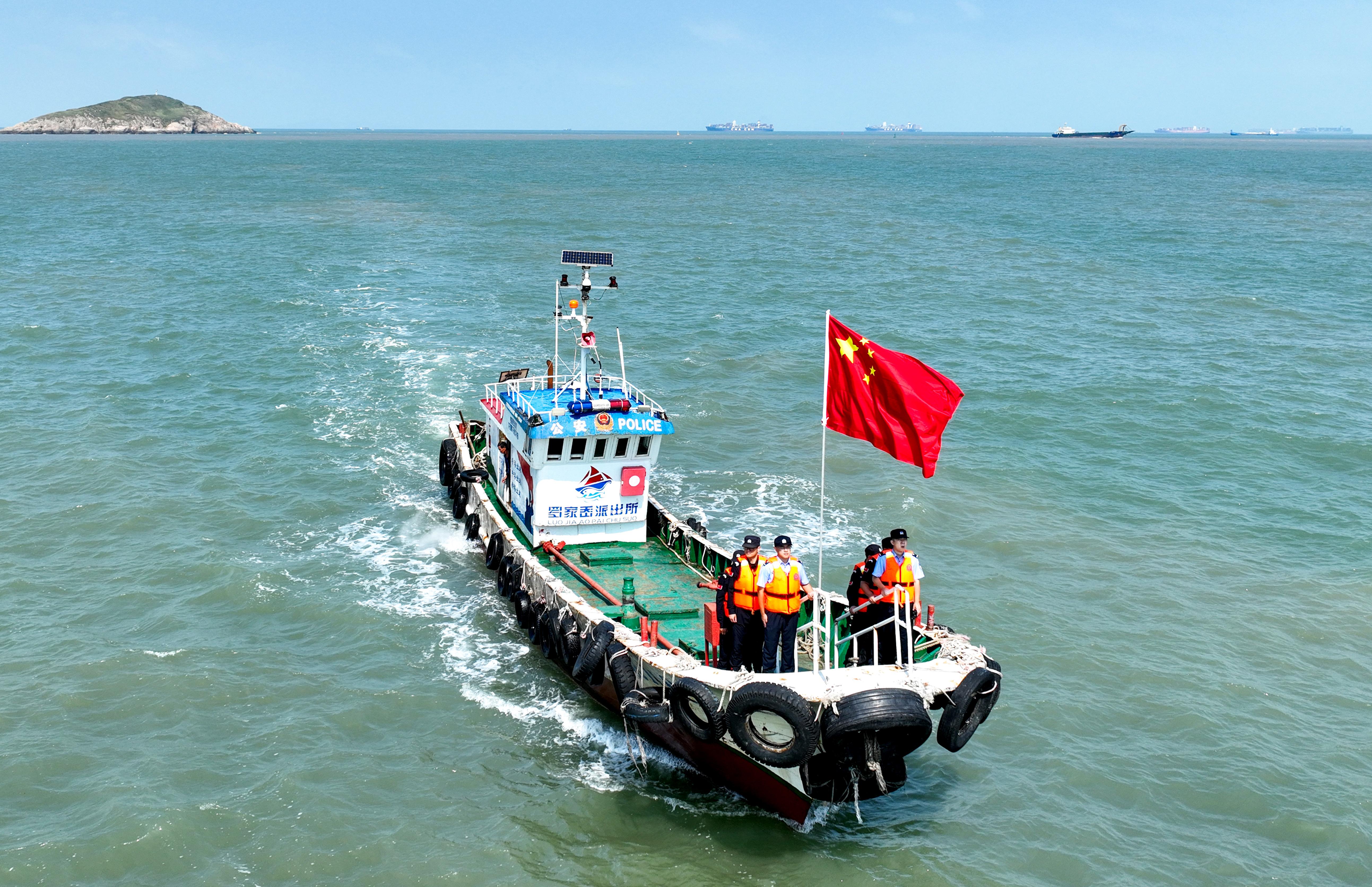 10月1日,浙江省舟山市岱山縣公安局羅家岙派出所民警輔警堅(jiān)守崗位,乘坐“紅帆110”船只開(kāi)展“祝福祖國(guó) 守護(hù)平安”主題海上巡查行動(dòng)。
