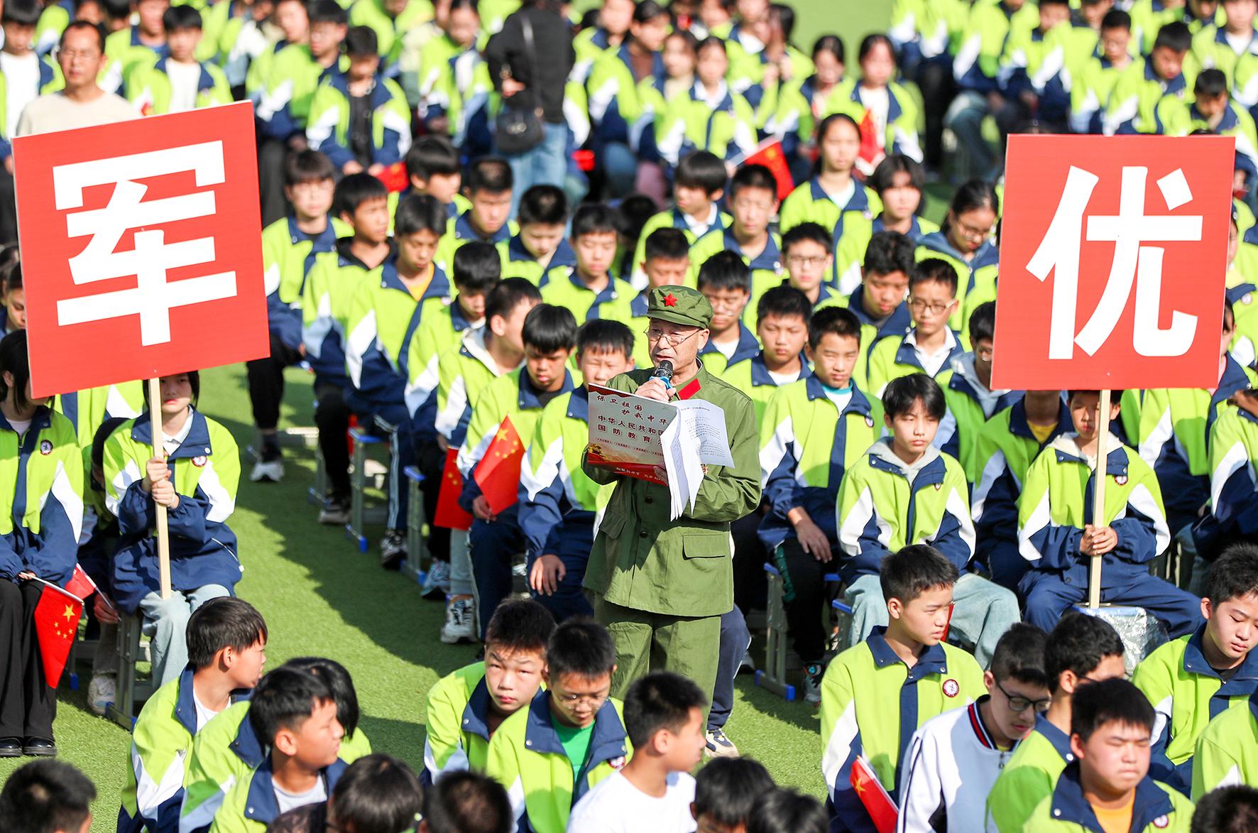 圖為10月15日,在華鎣二中國防教育法宣傳活動(dòng)現(xiàn)場,戰(zhàn)斗英雄張昌仁向?qū)W生們講述自己保家衛(wèi)國的戰(zhàn)斗故事。