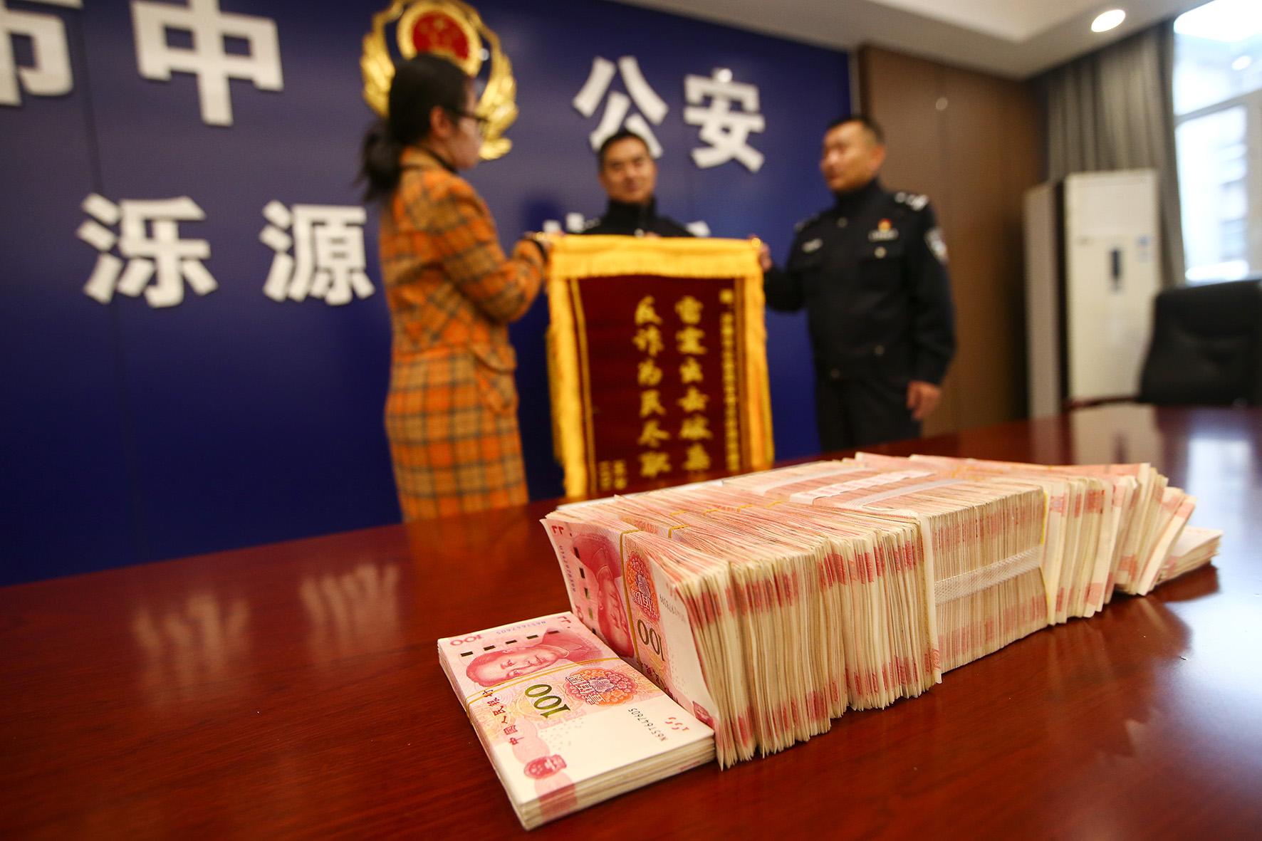 10月21日,在山東省濟(jì)南市公安局市中區(qū)分局濼源派出所,來自安徽的受害人李女士領(lǐng)取了被騙的24萬現(xiàn)金。