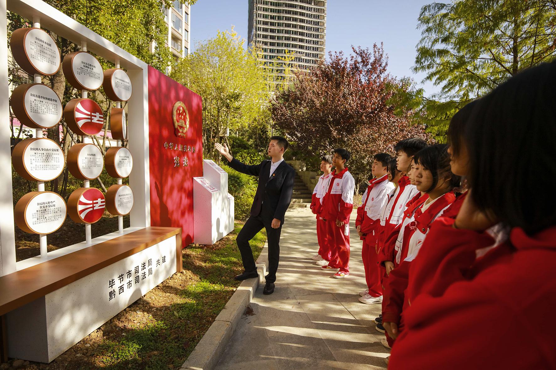 10月23日,貴州省黔西市第二中學(xué)的學(xué)生走進(jìn)蓮城街杜鵑湖法治公園,開(kāi)展沉浸式學(xué)習(xí)法治知識(shí)。