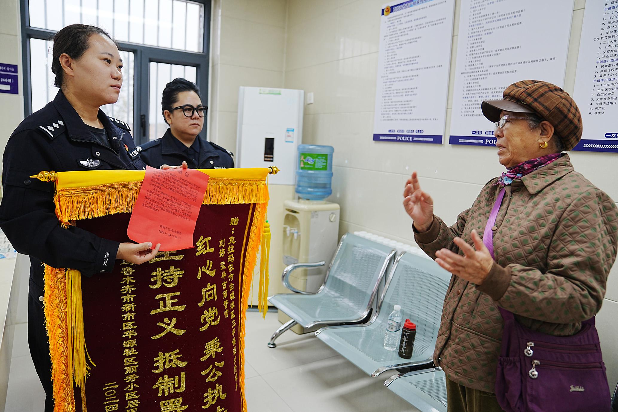10月29日,新疆維吾爾自治區(qū)烏魯木齊市馬女士跨越300公里專程來到克拉瑪依市公安局三平鎮(zhèn)派出所,將一面錦旗贈(zèng)給民警,感謝民警幫助其解決了兒子長(zhǎng)期沒有的戶口問題。