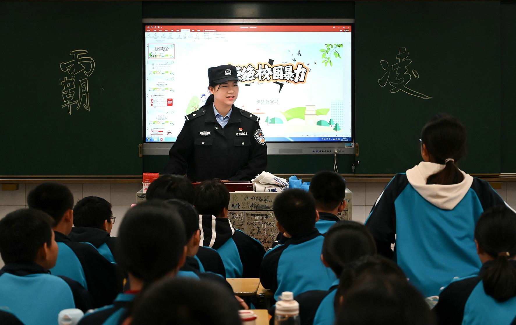 11月4日,安徽省馬鞍山市和縣公安局民警在校園開(kāi)展“拒絕暴力 反對(duì)校園欺凌”主題班會(huì)。