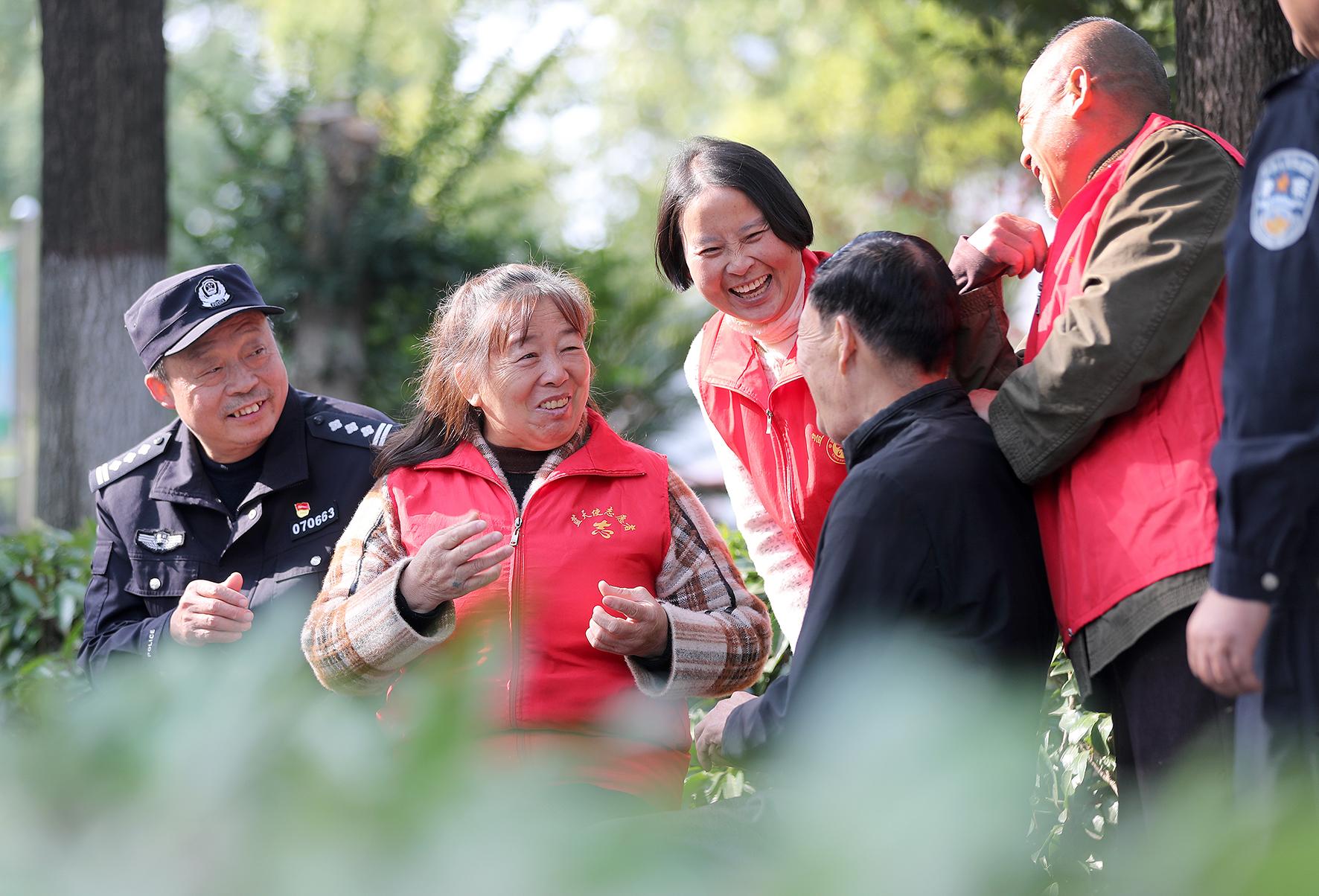 圖為11月5日,民警與救助對(duì)象一起在公園向老年人開展防范養(yǎng)老詐騙普法宣傳活動(dòng)。