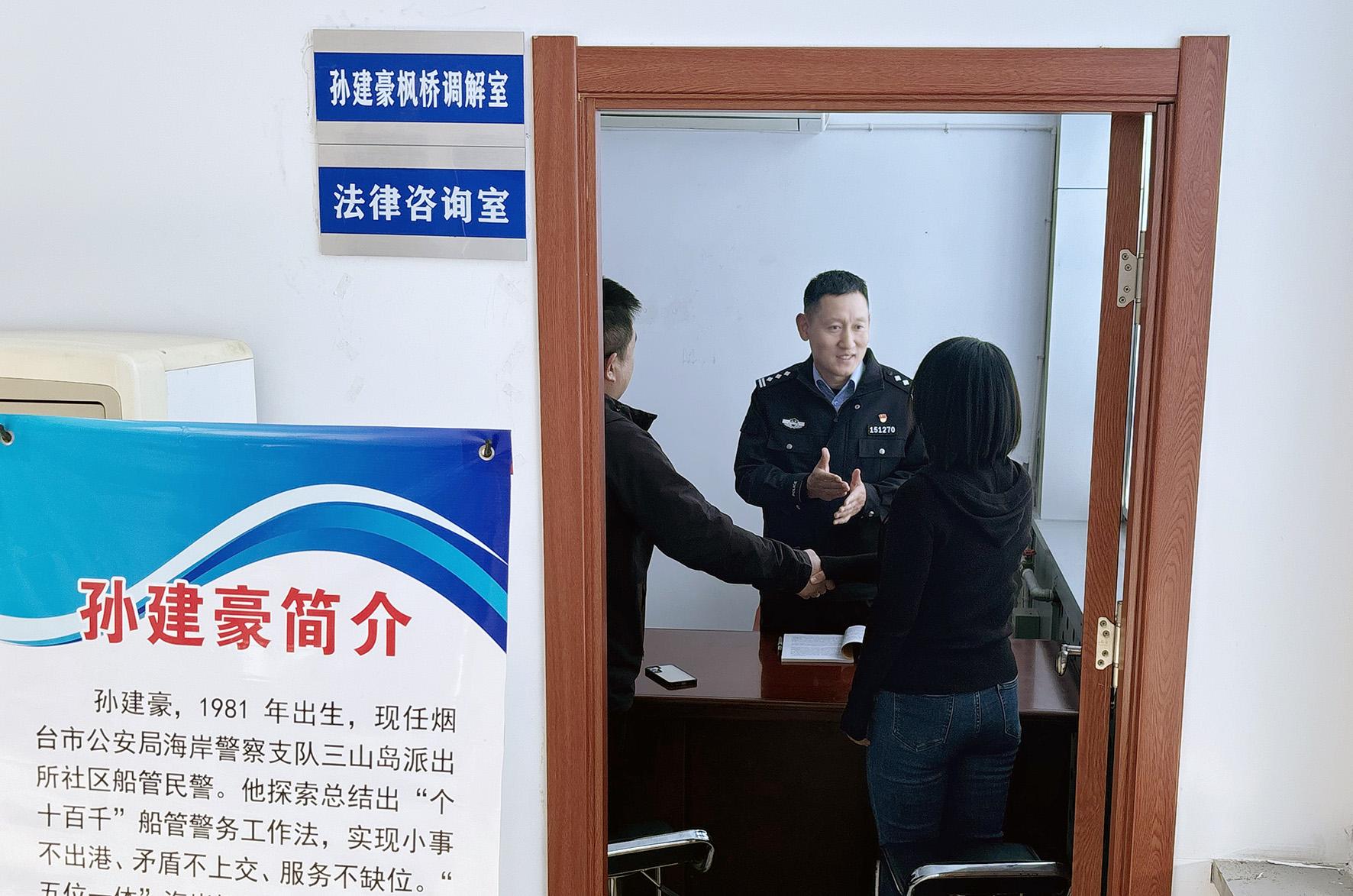 11月5日,山東省煙臺市海岸警察支隊(duì)三山島派出所民警孫建豪正在調(diào)解室內(nèi)調(diào)解一起糾紛。為推動(dòng)矛盾糾紛排查化解工作,萊州市三山島街道辦事處成立以海岸民警孫建豪命名的楓橋調(diào)解室。