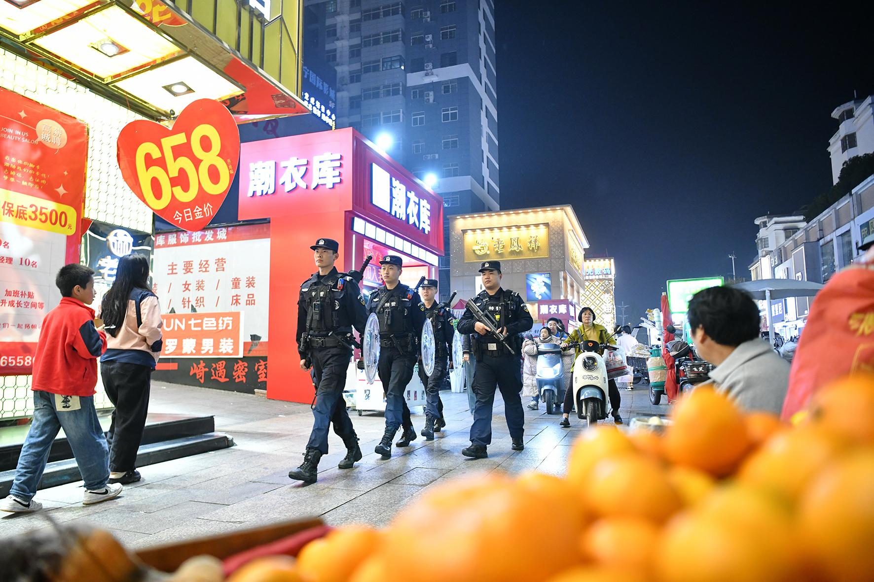 11月15日晚,安徽省阜南縣公安巡警在城區(qū)一商業(yè)步行街巡邏。阜南縣公安局巡防大隊(duì)加大夜間巡邏力度,采取車巡、步巡和視頻巡等相結(jié)合方式,對轄區(qū)主要街道、商業(yè)區(qū)和公園等人員密集場所和重點(diǎn)區(qū)域進(jìn)行不間斷巡邏,排查消除安全隱患,增強(qiáng)人民群眾的安全感、幸福感。