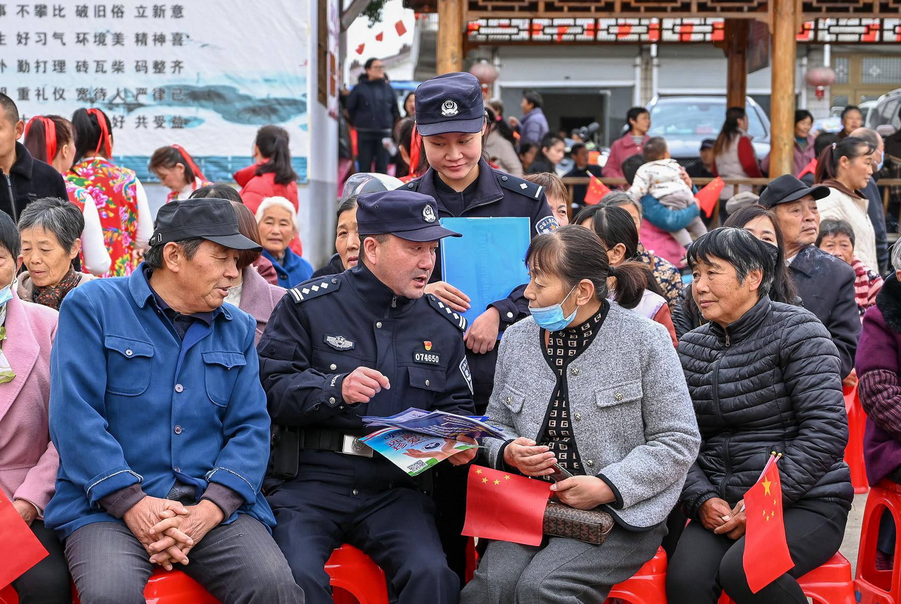 11月18日,在安徽省馬鞍山市和縣石楊鎮(zhèn)“安徽省2024四季村晚”現(xiàn)場,石楊派出所民警正在向村民開展普法宣傳,講解網(wǎng)絡(luò)詐騙、禁毒和冬季防盜知識,讓村民在享受精神大餐的同時(shí),提升法治意識和自我保護(hù)能力。
