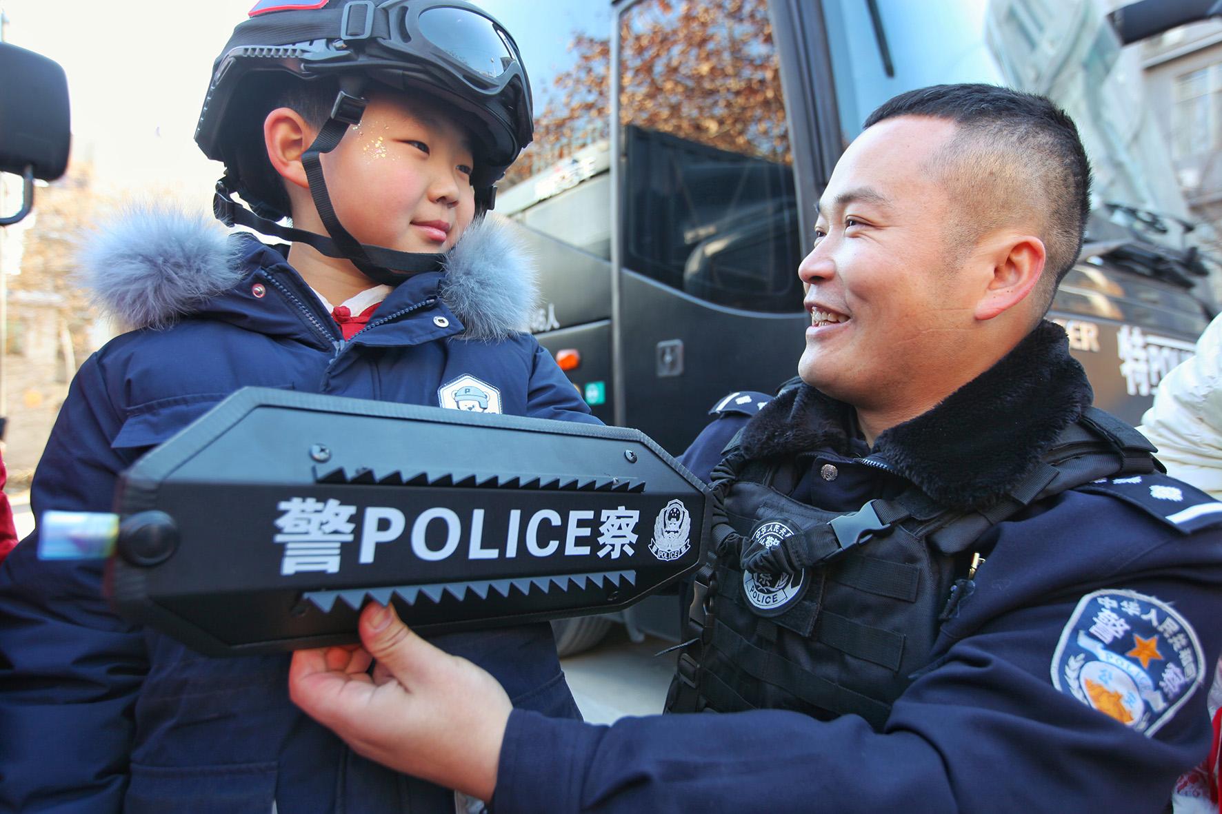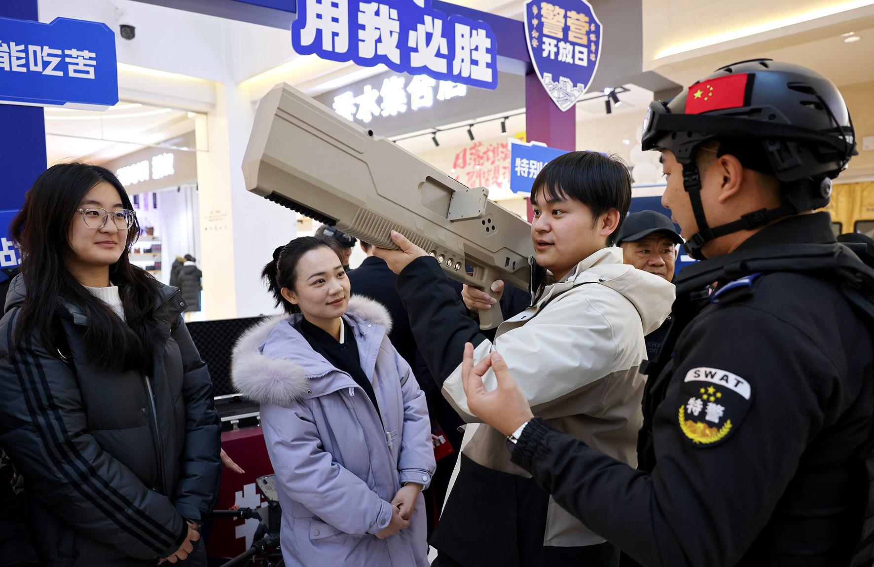 1月10日,第五個(gè)中國(guó)人民警察節(jié)。山東省棗莊市公安局警營(yíng)開放日活動(dòng)現(xiàn)場(chǎng),市民在體驗(yàn)警用裝備。