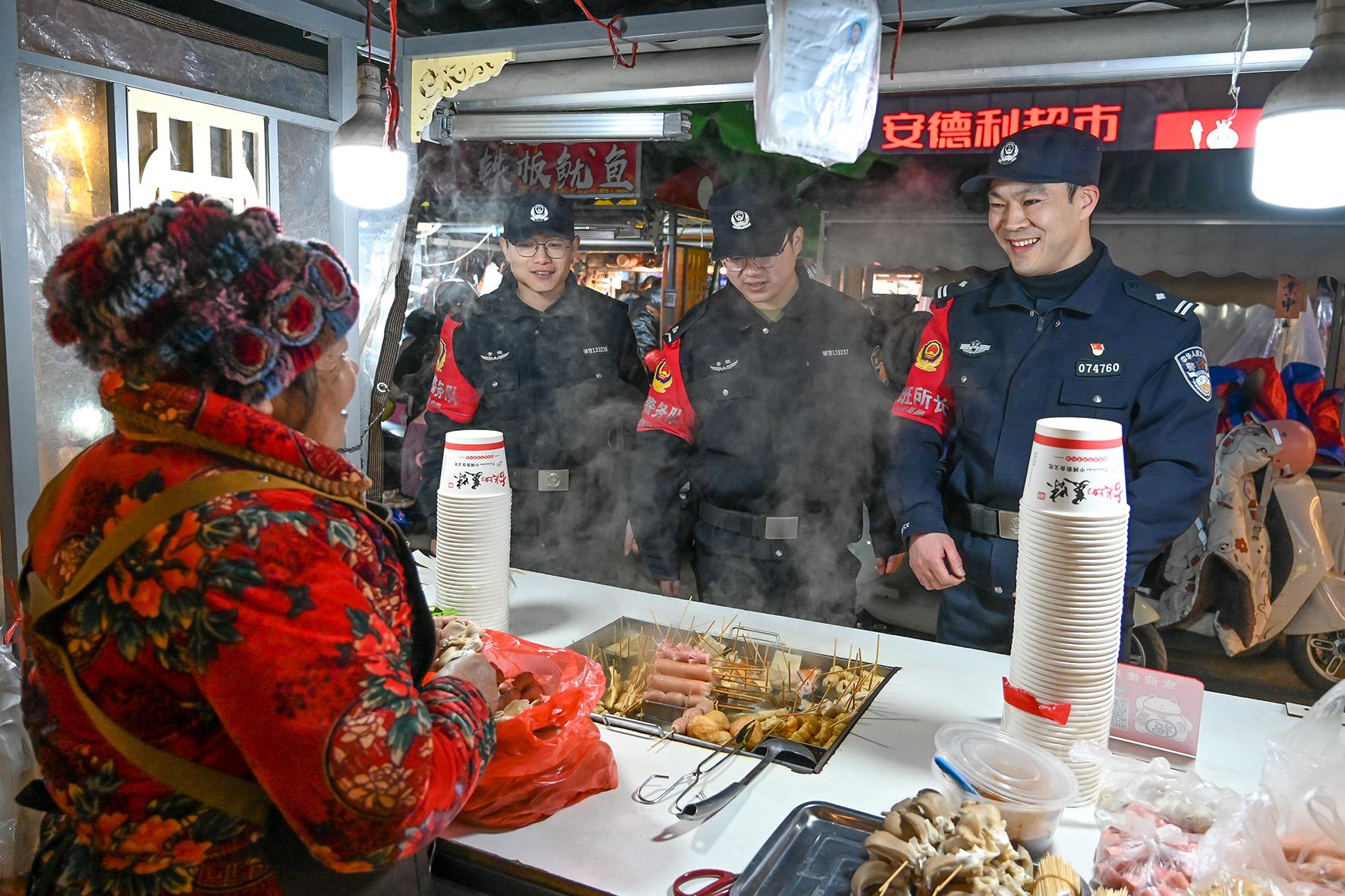 1月13日晚,安徽省馬鞍山市和縣公安局民警在美食街開展徒步巡邏,走訪經(jīng)營(yíng)戶了解治安狀況,守護(hù)夜市平安。