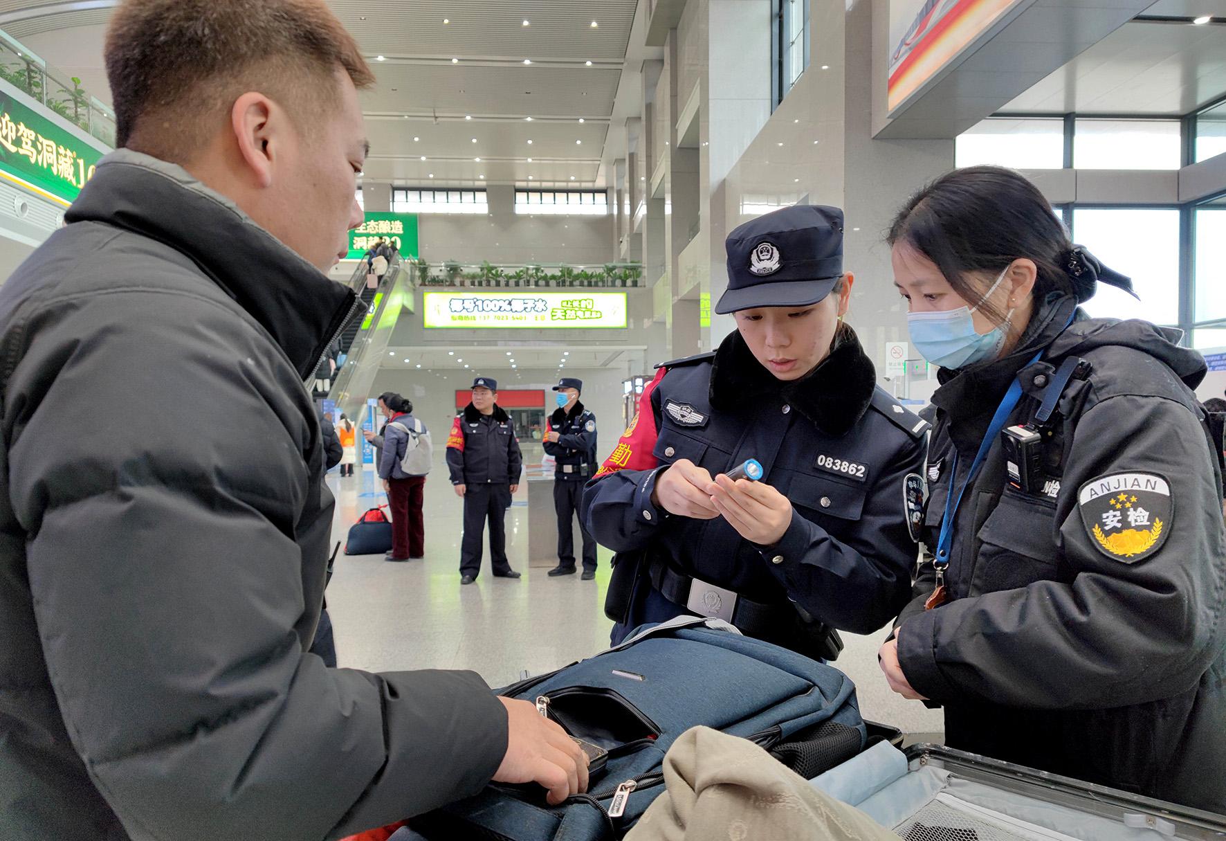 1月14日,春運首日,合肥鐵路公安處六安站派出所民警對乘客攜帶的疑似違禁物品進行仔細檢查。