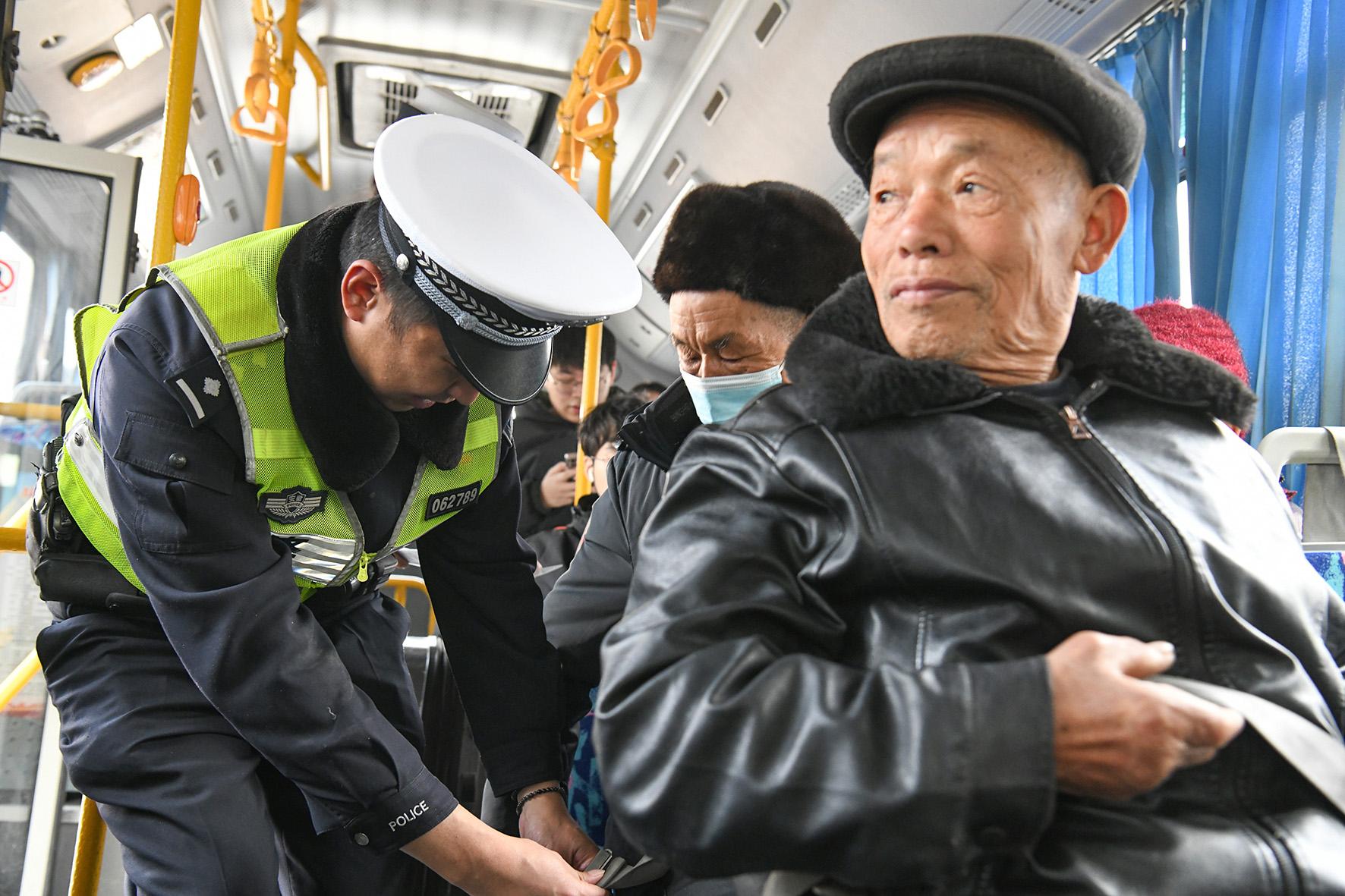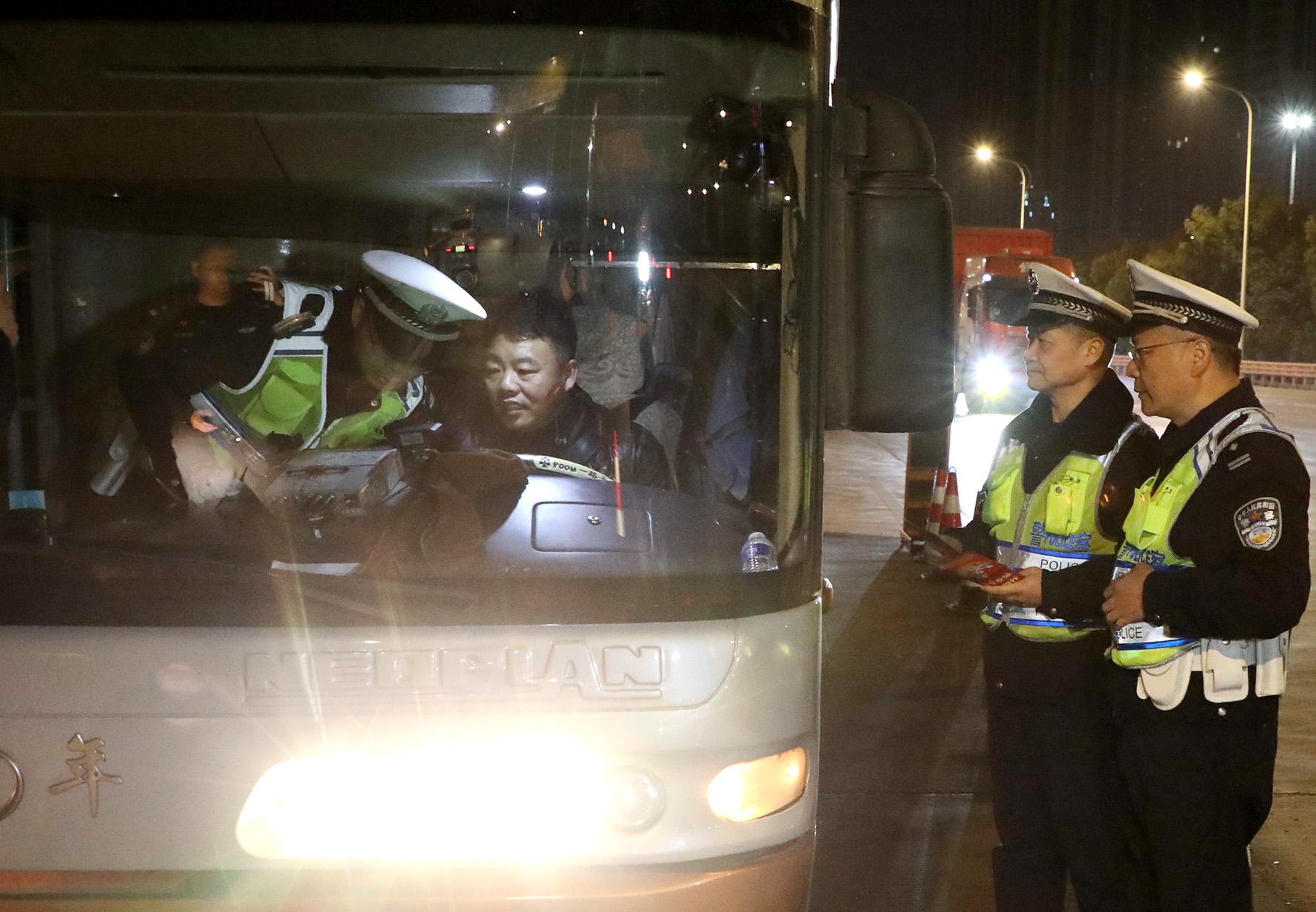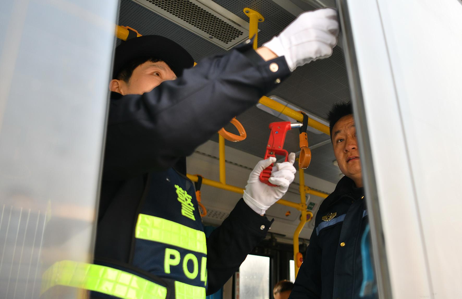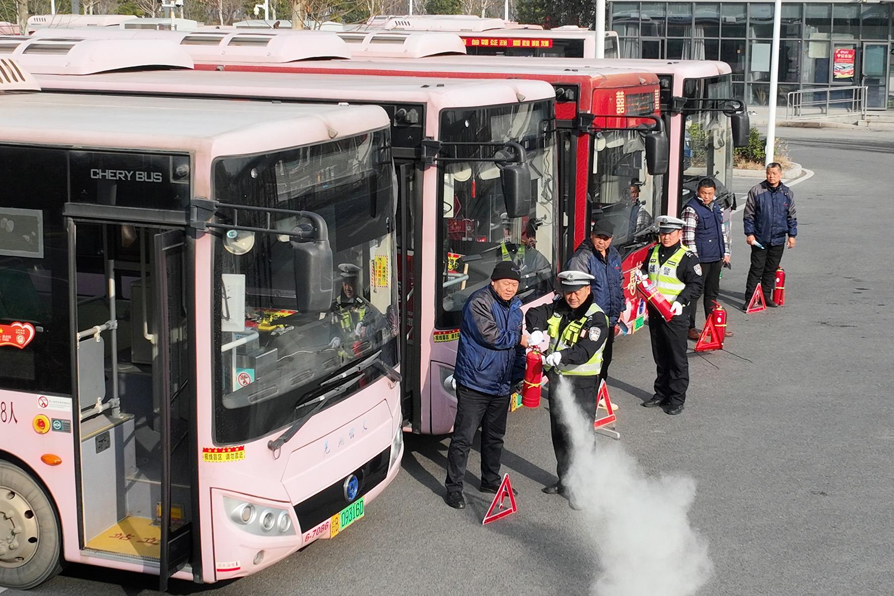 1月14日,安徽省蕪湖市公安局交警支隊鳩江大隊民警走進蕪湖北站公交樞紐,對參與“春運”的50余輛公交車進行安全大檢查。