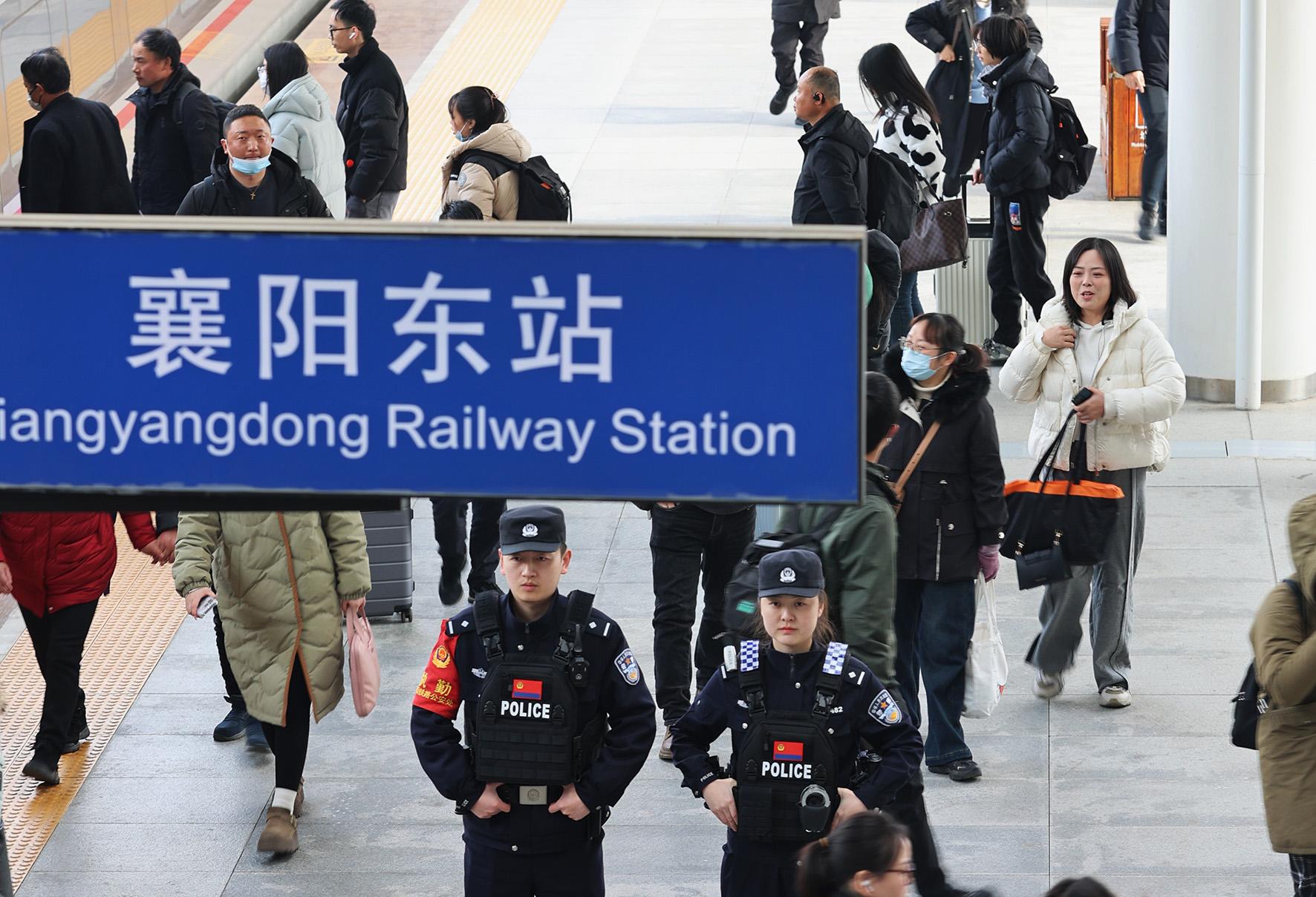 1月14日,襄陽鐵路公安處民警在襄陽東站執(zhí)勤,服務(wù)旅客。