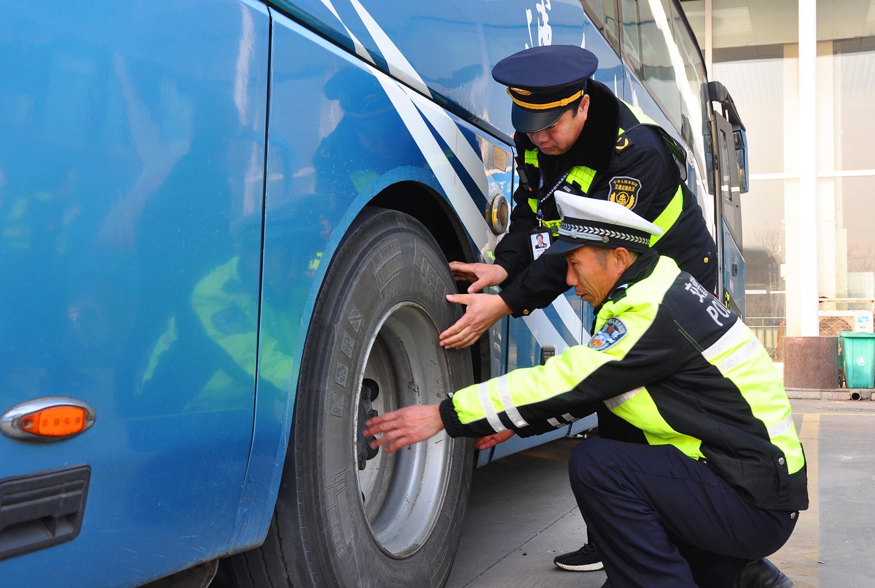 1月14日,安徽省阜南縣公安局交管大隊民警在客運站檢查客運車輛安全設(shè)施。